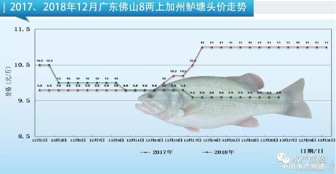 去年同期佛山8兩上加州鱸塘頭價在10.8-11元/斤左右,目前魚價同比去年低了1.4元/斤。和去年同期行情相比,今年魚價顯得較為低迷。業內人士認為,今年各產區加州鱸養殖產量同比去年有所增加,存塘量能夠滿足市場需求,導致魚價上漲較為乏力。
