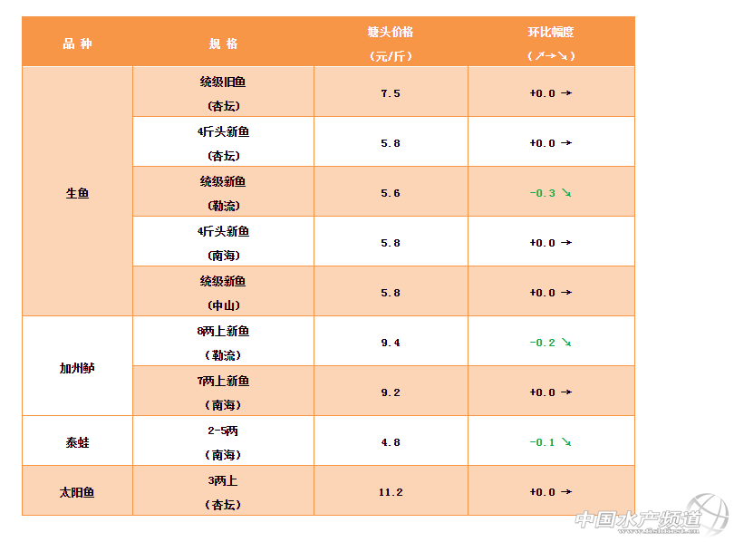 文/ 珠海海龍 水產前沿 吳佳輝 中國水產頻道原創報道,2018年12月28日生魚、加州鱸、泰蛙、太陽魚塘頭價格如下: 順德區域 杏壇區域生魚舊魚分級2斤上7.8-8.0元,2斤下4.7-5.0元。新魚陸續上市,3.5斤頭左右5.5-6.0元,建議養殖戶做好賣魚規劃。 勒流區域生魚魚價繼續低迷,市場走量下降,魚中虧錢撻訂。可能止住下跌的兩個因素,溫度繼續下降,全國大范圍豬肉無法供應情況下,促進生魚銷量提升或許能夠穩住跌勢。 中山區域 生魚近期生魚價格繼續低位徘徊,流通走量少,基本捉一塘訂一塘。舊魚分級2斤上7.8-8元,2斤下4.8-5元,新魚2斤上6.6-7元,2斤下4.6-4.8元。后市行情不明朗,新一輪冷空氣即將來臨,建議養殖戶提前做好預防處理。 南海西樵九江 近期生魚走魚量較為困難,不少魚中看魚訂魚都要到下月中旬出,導致發不起價,價格預計近期不會過大的波動。 |