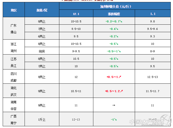 中國水產頻道獨家報道,三分鐘掌握各產區加州鱸12月行情 文/圖水產前沿 李曉欣 今天是2019年第一天,相信大家仍沉浸在辭舊迎新的喜悅之中。在剛剛過去的12月份,前期大多產區加州鱸塘頭價呈下滑態勢,但對加州鱸養殖戶而言可喜的是,近期廣東、湖北、四川等產區加州鱸行情出現回暖跡象,一方面是元旦節日消費增加,市場需求量上升;另一方面是受寒潮影響,氣溫劇降不利于拉網,加上多地大雪道路運輸受阻造成市場斷檔,促使魚價上漲。 有業內人士認為,魚價始終以市場供求為調節杠桿,目前產區總體存塘量仍較大,預計隨著銷量逐漸恢復正常水平,魚價總體不會有太大的升幅,建議養殖戶朋友理性看待行情走勢,根據自身情況合理安排時間出魚,確保養殖收益。 12月各產區行情簡析 廣東佛山:8兩上跌破10元/斤,元旦行情回暖 12月,佛山加州鱸塘頭價整體呈下滑態勢,近幾天受寒潮和元旦銷量走俏影響,魚價小幅回漲,今天佛山6兩上加州鱸報價9.3元/斤,7兩上9.5-9.6元/斤,8兩上9.8元/斤,1斤上10元/斤,實際看魚頭大小和8兩上規格比例定價。魚價低于10元/斤時,佛山當地養戶基本不大愿意出魚,部分養戶為了回籠資金而出大規格魚,以提高產量和效益。目前佛山本地存塘仍較大,預計隨著銷量逐漸恢復正常水平,魚價以企穩為主。 浙江湖州:養戶統貨清塘,魚價上漲乏力 由于統貨價格便宜,湖州本地魚中以收統貨為主,12月當地養戶大多在以統貨規格清塘,據悉,目前湖州統貨出塘價大多在8-9元/斤左右,9-9.5元/斤的基本很少。今天有一塘魚炮頭1.3斤,過磅6.8成,無夾子,塘頭價8.4元/斤。由于元旦期間當地走量變化不大,魚價上漲乏力。 江蘇吳江:魚價未及預期,本地出魚量小 12月上旬,吳江各規格加州鱸塘頭價下滑了0.5元/斤,而后一直維穩至今。今天7兩上報價9.5元/斤,8兩上10元/斤,目前魚價當地養戶基本很少出魚,大多在待價惜售。元旦期間當地銷量有所上漲,但養戶出魚意愿不強,預計接下來銷量會恢復正常,魚價波動不大。 四川成都:觸底反彈,上漲1元/斤 12月四川成都加州鱸塘頭價觸底反彈。前期由于魚價未達預期,當地養戶大多在觀望惜售,流通商為了滿足市場訂單而上調價格刺激養戶出魚,分別在13日和19日兩次上調0.5元/斤。目前成都9兩上加州鱸報價12.5-13元/斤,受天氣影響,流通商到廣東拉魚減少,加上當地存魚達上市規格的有所減少,預計后市魚價還有一定波動。 湖北武漢:魚價趨穩,市場上以廣東魚為主 湖北武漢加州鱸塘頭價在企穩了近兩個月后,終于在12月底迎來上漲的好消息。今天9兩上塘頭報價11.5-11.7元/斤左右,相比上月10.5-11元/斤上漲了0.7-1.2元/斤,主要是受元旦銷量增加影響。 湖南華容:走量不大,魚價企穩 12月華南華容加州鱸塘頭價維持在11元/斤左右,當地魚走量不大,養戶開始惜售等價。近幾天受大雪天氣影響,養戶出魚意愿不大,當地走魚量有所下降。 廣西南寧:受廣東魚影響,下滑1元/斤 南寧當地達上市規格的魚較少,市場以廣東魚為主。受廣東魚影響,12月南寧1斤上加州鱸塘頭價從12-13元/斤下跌至11-12元/斤,跌幅1元/斤。近期當地養戶出魚意愿不大,流通商多到廣東拉魚回本地市場。 今日加州鱸塘頭價與上月對比 |