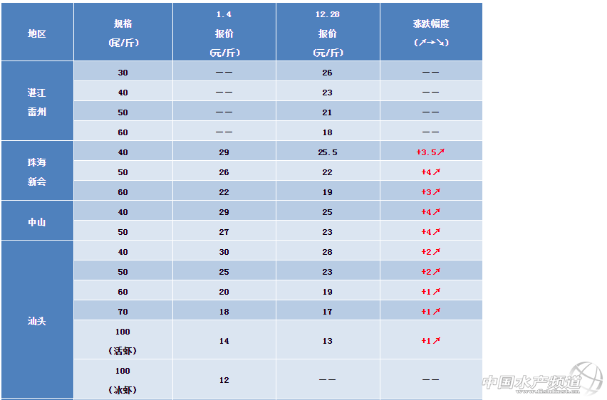 各產區白對蝦一周價格分析 湛江雷州:存塘規格蝦少,暫停報價。 海南?冢捍嫣烈幐裎r少,暫停報價。 中山區域:40頭29元/斤,50頭27元/斤,本周各規格蝦價同比上漲4元/斤。目前中山區域白水塘已經結束,冬棚蝦有部分開始上市; 珠海新會:40頭29元/斤,50頭26元/斤,60頭22元/斤。本身存塘量少,受到寒潮與元旦拉動,價格如期上漲,上漲幅度較大,部分蝦中隱瞞價格上漲幅度,導致不同村、不同蝦中之間差別較大。建議養殖戶多問兩個蝦中出蝦。 廣西北海:存塘規格蝦少,暫停報價。 汕頭區域:本周蝦價40頭30元/斤,50頭25元/斤,60頭20元/斤,70頭18元/斤,活蝦100頭14元/斤,冰蝦100頭12元/斤。高位池大規格蝦存塘量減少,養殖主要規格在30-100頭。隨著溫度下降,池塘存塘蝦減少,蝦價逐漸提高。土塘大部分池塘清塘,剩余蝦少。本周蝦價格同比上周上漲1-2元/斤。 漳州區域:本周蝦價30頭34元/斤,40頭30元/斤,50頭25元/斤,60頭21元/斤。高位池大規格蝦的主要養殖規格在30-100頭/斤,隨著近期天氣降溫,病害增加,排塘增加,存塘蝦減少。本周蝦價格同比上周上漲1-3元/斤。 江蘇如東:存塘規格蝦少,暫停報價。 上海地區:上海市場已經結束。 浙江紹興:紹興市場已經結束。 ※上述報價可能會因區域、規格、品質和時間等因素的不同而會產生差異,在此僅供參考。 |