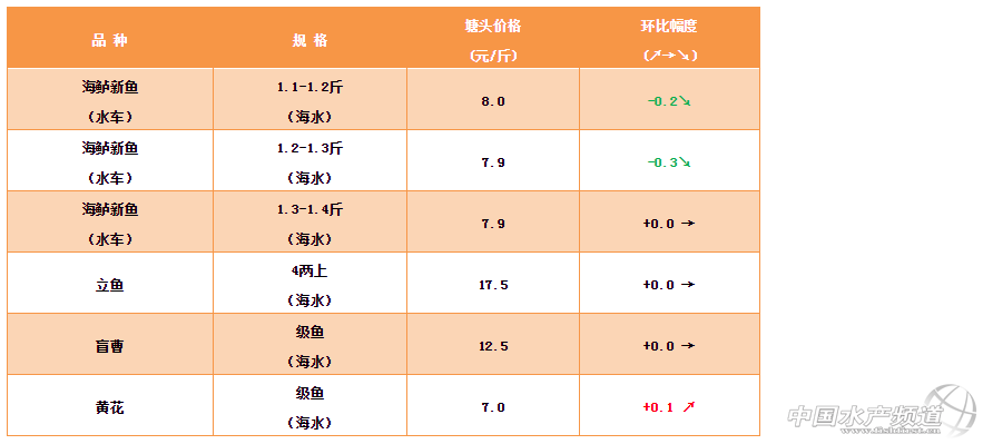中國水產頻道原創報道,鱸魚:新魚受需求量減少影響,價格微跌,后市需求量預計增大,看漲。