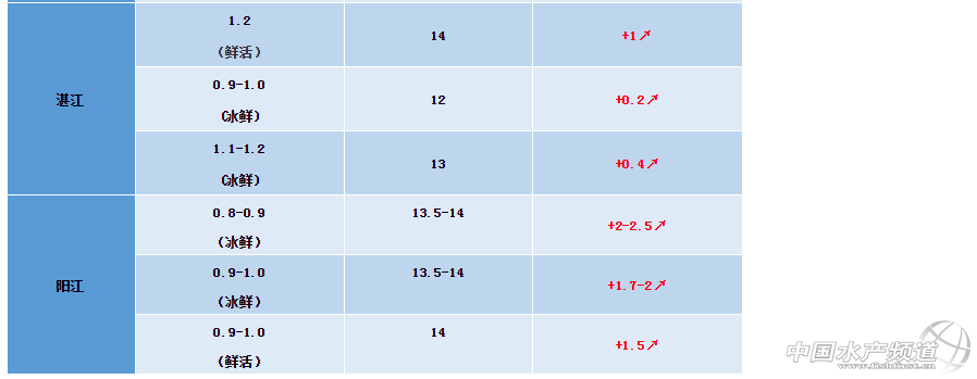 文/ 水產前沿 植銀素 中國水產頻道原創(chuàng)報道,廣西區(qū)域:由于降溫的影響,規(guī)格魚大多提前出魚,目前規(guī)格魚存量較少,規(guī)格魚量少價漲,但整體成交量較少,各規(guī)格凍品價格基本與上周持平。凍品(新魚)200/30010.5元/斤(+0.25);300/40011.5元/斤(平);400/50012.5元/斤(平);500/60013元/斤(平);600/70013.8元/斤(+0.05);700/80014.15元/斤(平)。 ※上述報價可能會因區(qū)域、規(guī)格、品質和時間等因素的不同而會產生差異,在此僅供參考。環(huán)比幅度以本周價格與上周價格數據做對比 【關鍵字】:金鯧魚 金鯧魚價格 水產養(yǎng)殖 |