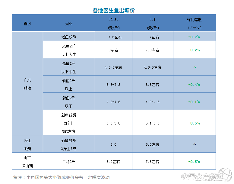 中國水產頻道原創報道, 文|圖 何氏水產 水產前沿 李靜 1、本周廣東生魚價格持續下跌,5斤老魚魚頭統貨與上周相比下跌了0.2元/斤,成交價在6.8元/斤左右,6斤以上魚頭統貨價格7.0元/斤左右,還是主要看2斤以上大生比例與魚頭來定價。2斤以上老大生市場行情一般,銷量下降,價格比上周也下跌了0.2元/斤左右,5斤魚頭價格7.6元/斤,6斤魚頭價格在7.8元/斤,還是看魚頭與條形來定價。本周2斤以下老魚小魚市場行情與上周差不多,價格與上周一樣,成交價還是在4.8-5.0元/斤左右,銷量上漲。 2、新魚繼續大量上市,2斤以上5成的統貨成交價持續下跌,成交價只有5.1-5.3元/斤,塘頭的實際成交價是根據2斤上下的比例圍出來的,如果2斤以上成數不好的,成交價還會更低。2斤以上成數越多價格越高,主要看抓魚的規格與魚頭來定價。2斤以上新魚,魚頭4斤左右的,價格比上周下跌了0.4元/斤,成交價6.8元/斤,新魚2斤以下成交價比上周下跌了0.1元/斤,只有4.2-4.5元/斤,預測接下來價格持穩。 2、浙江湖州3斤以上的價格與上周一樣,山東微山湖價格比上周下跌了0.5元/斤,銷量穩定。 |