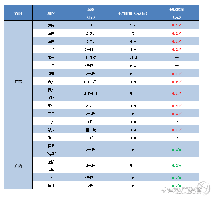 中國水產(chǎn)頻道原創(chuàng)報道, 廣東、華東草魚行情大好,各地漲漲漲! 文/ 水產(chǎn)前沿 鄭鵬飛 一周要聞 本周珠三角地區(qū)價格整體呈上漲趨勢,開平地區(qū)最高上漲0.7元/斤。據(jù)了解,最近草魚苗種開始走俏,中山地區(qū)1-3兩的苗種最高已經(jīng)賣到5.8元/斤。本周福建地區(qū)草魚上漲勢頭強勁,最新塘頭價較上周整體上漲0.3-0.5元/斤,草魚價格全線突破6元大關(guān)。 養(yǎng)殖戶表示,最近水產(chǎn)市場異常繁忙,魚車紛紛出動搶魚,白沙洲市場上大草魚拉過去很快就被搶光,5斤草魚報價6.2-6.5元/斤。由于賣魚的增多,前幾天華中、華東以及北方大部分地區(qū)草魚價格出現(xiàn)小幅下滑,廣西地區(qū)較上周下滑0.2-0.3元/斤。 今日行情 華南地區(qū) 這幾天珠三角地區(qū)草魚價格全線飆紅,中山、珠海、江門、臺山等地草魚價格均出現(xiàn)0.1-0.2元/斤的上漲。開平地區(qū)草魚最高上漲了0.7元/斤,2斤草魚最新塘頭價突破5元/斤。近期,受華南地區(qū)氣溫回暖影響,養(yǎng)殖戶放苗非常積極,草魚苗種開始走俏,大涌地區(qū)1-3兩的草魚已經(jīng)賣到5.8元/斤。 中山:本周中山地區(qū)大規(guī)格草魚價格基本穩(wěn)定,草魚苗種開始走俏。據(jù)流通商介紹,目前大涌地區(qū)1-3兩的草魚苗最新塘頭價5.8元/斤,2-5兩賣5元/斤,3-7兩的賣4.6元/斤,目前整體價格穩(wěn)中緩慢回升。目前中山地區(qū)統(tǒng)鯇基本賣到4.8-4.9元/斤,5斤以上的賣6.2-6.8元/斤,6斤的草魚塘頭價7.2元/斤,目前保持穩(wěn)定。 江門:本周江門地區(qū)草魚價格也是出現(xiàn)小幅回升,其中2斤起的草魚最新報價4.7-4.8元/斤。 肇慶:目前,肇慶地區(qū)草魚價格也是有部分上漲,整體上漲不明顯。超市鯇最新報價4.3元/斤,較上周上漲0.1元/斤。養(yǎng)殖戶表示,目前魚車不多,短期內(nèi)價格可能起不了。 開平:這兩天,開平地區(qū)的草魚價格出現(xiàn)明顯上漲,最高上漲了0.7元/斤。臺山地區(qū)2斤左右的草魚最新報價4.7-4.8元/斤。 梅州:據(jù)業(yè)內(nèi)人士介紹,目前梅州地區(qū)4斤以上的草魚賣5.8元/斤,2-4斤的賣5.2-5.3元/斤,走量有所增加,廣州和佛山等地草魚最新報價基本保持穩(wěn)定。 廣西:最近,廣西的草魚價格出現(xiàn)一波下,整體下滑幅度為0.2-0.3元/斤。從養(yǎng)殖戶了解到,貴港、金陵和桂林等地區(qū)的最新塘頭價已經(jīng)跌回到5元/斤,目前魚不是很好賣。 華中地區(qū) 最近,華中地區(qū)進入了干塘和放苗的小高峰,大批草魚涌向市場導致近期魚不太好賣,價格整體出現(xiàn)0.2-0.4元/斤下滑。從養(yǎng)殖戶了解到,目前南昌、常德、洪湖等地草魚價格下滑比較明顯,南昌地區(qū)1.6斤的草魚最低賣到3.9元/斤,2斤草魚基本都在4.1元/斤左右。養(yǎng)殖戶表示,目前草魚市場熱鬧非凡,今天武漢白沙洲市場的草魚價格較昨天已經(jīng)回暖了0.1-0.2元/斤,尤其大草魚一到市場就被搶光,5斤以上大草魚最新塘頭價6.2-6.5元/斤。 江西:本周江西地區(qū)草魚整體行情比較低迷,魚不太好賣。有養(yǎng)殖戶表示,目前南昌部分地區(qū)草魚價格出現(xiàn)下滑,1.6-1.7斤規(guī)格的草魚最低賣3.9元/斤,2.5斤的賣4.1元/斤;樟樹的地區(qū)小規(guī)格的草魚賣4.1元/斤,大一點的賣4.6-4.7元/斤;贛州地區(qū)2.5-3斤的網(wǎng)箱草魚最新報價5.1元/斤,3斤以上的賣5.2-5.3元/斤;宜春地區(qū)3斤以下的草魚賣4.1元/斤。 湖南:從養(yǎng)殖戶了解到,目前湖南地區(qū)草魚整體行情也是不太好,草魚走不動,這幾天常德地區(qū)有部分市場草魚下滑了0.3-0.5元/斤。 湖北:本周湖北地區(qū)草魚整體還算穩(wěn)定,小規(guī)格草魚價格出現(xiàn)下滑,大草魚繼續(xù)吃香。有養(yǎng)殖戶表示,最近出魚量比較大,魚車比之前多了很多,場面比較火爆,今天白沙洲和仙桃市場草魚價格較昨天上漲了0.1-0.2元/斤,大草魚基本是拉到市場很快就被搶光,5斤以最新報價6.2-6.5元/斤。前兩天洪湖地區(qū)草魚價格跌了,2斤的草魚賣4.3元/斤,5斤的賣4.8-5元/斤。目前,隨州地區(qū)的草魚價格還是沒怎么,基本維持穩(wěn)定。 華東地區(qū) 本周華東地區(qū)草魚整體保持穩(wěn)定,其中福建地區(qū)整體繼續(xù)以上漲為主,江蘇、安徽、浙江、上海等地區(qū)草魚行情相對低迷,部分地區(qū)價格有小幅下滑;窗驳貐^(qū)5斤的草魚最新報價4.8-5元/斤,養(yǎng)殖戶表示魚不好賣。福建三明地區(qū)3斤的草魚塘頭價最高賣到6.2元/斤。 江蘇:由于最近出魚比較多,本周江蘇地區(qū)草魚行情出現(xiàn)小幅下滑。據(jù)了解,目前徐州、淮安、無錫等地區(qū)草魚不太好賣,部分地區(qū)價格有所下滑。養(yǎng)殖戶表示,目前淮安地區(qū)5斤的草魚最新報價只有4.8-5元/斤,行情不好。 福建:本周福建地區(qū)草魚整體還會保持上漲趨勢,最新塘頭價較上周整體上漲0.3-0.5元/斤。從養(yǎng)殖戶了解到,目前南平地區(qū)3斤的網(wǎng)箱草魚最新塘頭價6-6.1元/斤,三明地區(qū)最新塘頭價賣6元/斤,最高賣到6.2元/斤,價格繼續(xù)上漲;閩湖地區(qū)的草魚價格出現(xiàn)小幅下滑。 其他地區(qū) 本周西南地區(qū)草魚較之前好賣了一些,但是目前價格還是沒有明顯回升,四川德陽地區(qū)最新塘頭價5.3元/斤。最近,北方地區(qū)草魚行情不太好,沈陽地區(qū)最新塘頭報價下滑0.1-0.2元/斤,3斤多的草魚賣5.3元/斤,2斤的草魚回落到5元/斤。目前,西北地區(qū)草