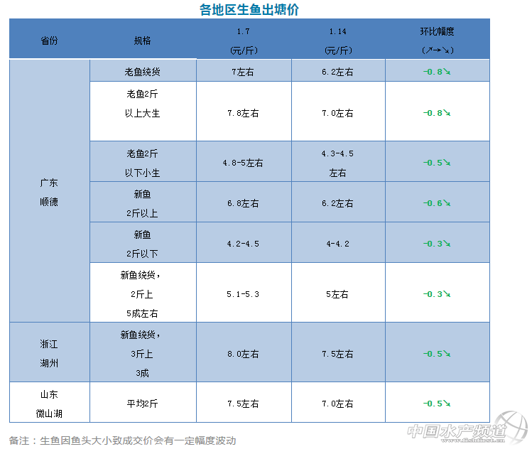 中國水產頻道原創報道, 文|圖 何氏水產 水產前沿 李靜 1、 本周廣東生魚價格大幅下跌,跌幅達到0.3-0.8元/斤,5斤老魚魚頭統貨與上周相比下跌了0.8元/斤,成交價在6.0元/斤左右,6斤以上魚頭統貨價格6.2元/斤左右,還是主要看2斤以上大生比例與魚頭來定價。2斤以上老大生市場行情與上周并不多,價格比上周也下跌了0.8元/斤左右,5斤魚頭價格6.8元/斤,6斤魚頭價格在7.0元/斤,還是看魚頭與條形來定價。本周2斤以下老魚小魚市場行情與上周差不多,價格比上周也下跌了0.5元/斤,成交價還是在4.3-4.5元/斤左右,銷量上漲。 2、 新魚繼續大量上市,成交價比較亂,一天一個價格,2斤以上5成的統貨成交價持續下跌,成交價只有5元/斤,塘頭的實際成交價是根據2斤上下的比例圍出來的,如果2斤以上成數不好的,成交價還會更低。2斤以上成數越多價格越高,主要看抓魚的規格與魚頭來定價。2斤以上新魚,魚頭4斤左右的,價格比上周下跌了0.6元/斤,成交價6.2元/斤,新魚2斤以下成交價比上周下跌了0.3元/斤,只有4.0-4.2元/斤,預測接下來價格還會微跌。 2、浙江湖州與山東微山湖本年存塘量也很多,本周價格比上周雙雙下跌了0.5元/斤,銷量有所上升。 |