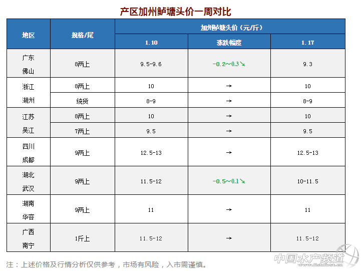 中國水產頻道原創報道, 本周產區加州鱸塘頭價穩中有降,廣東佛山出魚量能夠滿足市場需求,8兩上加州鱸一周內下滑了0.2-0.3元/斤;受廣東魚影響,湖北武漢魚價有所下滑,目前報價較亂,9兩上10-11.5元/斤不等。現在距離春節僅半個多月時間,預計隨著春節越來越臨近,市場銷量將上升,行情或將有所好轉。 廣東佛山 本周佛山8兩上加州鱸下跌了0.2-0.3元/斤,今天報價9.3元/斤左右,最終成交價看魚頭及8兩上比例略有浮動。目前魚價低迷,養戶一般出魚意愿不大,部分養戶為了周轉資金還款而出魚,還有一些養戶擔心存塘魚超大或要空塘準備育苗而出魚,以出8兩上規格為主。目前佛山當地存塘量較大,能夠滿足市場需求。臨近春節假期,預計市場需求量將大幅增加,銷量或將走俏。 浙江湖州 本周湖州魚價持穩,今天報價7兩上9.5元/斤,8兩上10元/斤,統貨8-9元/斤,實際成交價看炮頭及整塘魚成數。當地養戶出魚以統貨規格為主,今天有魚中抓炮頭1.5斤,成數5.5成,塘頭價8.3元/斤;炮頭1.3斤,成數6.7成,塘頭價8.8元/斤。據悉,當地池塘魚成數較高的養戶出魚意愿不大,成數較低的養戶出魚較為積極,目前湖州出魚量能夠滿足市場需求,預計魚價以持穩為主。 江蘇吳江 吳江魚價一周持穩,今天報價7兩上9.5元/斤,8兩上10元/斤,目前價格吳江養戶出魚意愿不大,加上當地有存魚等到夏天再賣的習慣,本地出魚量較少。流通商多到周邊的湖州地區收魚,預計近期魚價應該較為平穩。 四川成都 本周成都9兩上加州鱸塘頭價維持在12.5-13元/斤左右,由于天氣略有回升,養戶出魚積極性有所提高。目前當地存魚達上市規格的有所減少,預計后市魚價或有所波動。 湖北武漢 本周武漢加州鱸塘頭價出現下滑,目前報價較亂,有9兩上11.5元/斤,7-9兩規格10.8-11元/斤;也有人報價9兩起步10-10.5元/斤,主要是受廣東魚價影響。當地養戶資金相對寬裕的出魚意愿較低。 湖南華容 華容加州鱸塘頭價一周持平,9兩上報價11元/斤。目前魚價養戶出魚積極性不高,由于廣東魚便宜,流通商多到廣東拉魚,華容當地走量很少。 廣西南寧 南寧1斤上加州鱸塘頭價維持在11.5-12元/斤,目前南寧本地達上市規格的存魚量少,流通商多到廣東收魚。 |