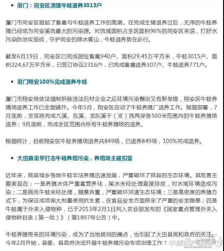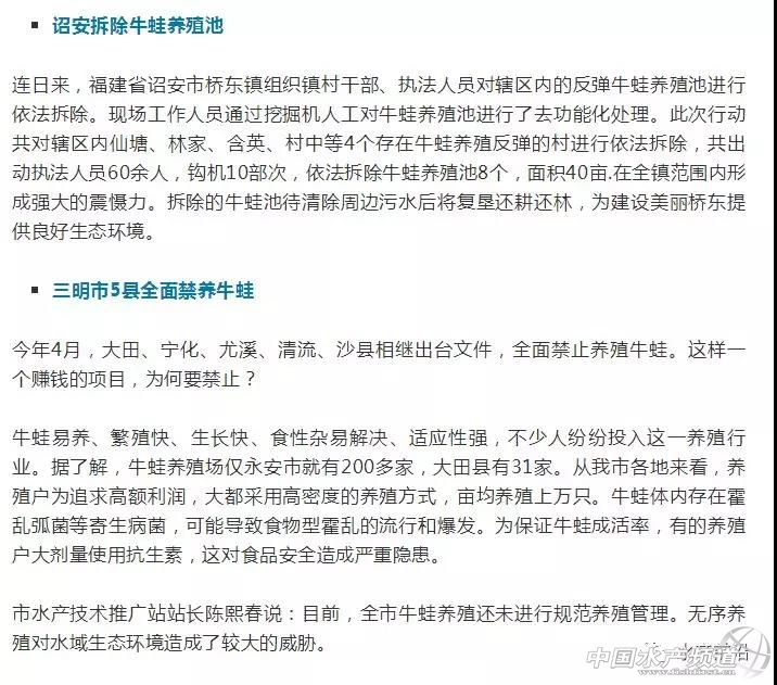 文/圖 中國水產頻道綜合整理 2019養殖什么品種更賺錢?——牛蛙? 中國水產頻道綜合整理報道,養什么品種利潤高、市場上最受歡迎,這是很多養殖戶所關注的問題。此前,我們根據2018年的市場統計數據,精選出當前行業關注度高、搜索熱門以及養殖規模增長明顯的十大水產養殖品種,其中牛蛙傲然在列。 一個由國內餐飲市場所帶動的養殖熱潮——牛蛙養殖。它的肉質細膩,且具有養殖技術簡單、成活率高、出肉率高、養殖周期短等特點,目前已大部分取代了青蛙肉的市場銷售,年總養殖量在30萬噸左右。但由于牛蛙屬于外來物種,且高密度養殖牛蛙所產生的環境污染問題嚴重,目前江西、廣東、福建等地區已禁養,從而造成牛蛙市場價格的高升,最高曾達17元/斤。 市場供不應求,超過10元/斤就是暴利 牛蛙自20世紀60年代引入我國,經50余年的發展,牛蛙養殖技術逐漸成熟。據不完全統計,在2013年中國的牛蛙產量達到15萬噸。由于當時供求關系不平衡,導致眾多牛蛙養殖戶虧本。2015年牛蛙最低收購價不到3元/斤,2016年,暴漲至15元/斤,最低在4-5元/斤。2017年,牛蛙行情最低時5-6元/斤,最高時接近15元/斤。一般來說維持在七八塊錢的時候,養殖戶的利潤就比較可觀了,超過10塊錢就是暴利了。這也是很多牛蛙養殖戶堅持養殖的根本原因。 浙江地區的牛蛙養殖歷史由來已久,目前主要集中于湖州千金、雙林和德清等地。2018年,由于各地相繼出臺禁養牛蛙的政策,牛蛙養殖量日益減少,然而市場的需求量卻在不斷擴大,牛蛙供不應求使得不少牛蛙養殖戶賺的盆滿缽滿。 參考一則消費需求數據: 截止到2018年2月,全國牛蛙特色餐廳數量超過2.2萬家,相比2017年同期增長2691家,比2016年同期則增長4443家。這個數字還在持續增長。從百度指數來看,小龍蝦的夏季消費高峰過去之后,牛蛙的搜索指數甚至超過了小龍蝦。 《美團餐飲報告2018》顯示,以牛蛙、小龍蝦、酸菜魚等作為招牌的單品餐廳越來越多,而且各個單品品類均出現了代表性的品牌。 全國Top10省市地區牛蛙餐廳數量(數據來源:美團點評) 另外,由于牛蛙的肉質,各種菜系也都開始使用牛蛙入菜,甚至江浙菜系也包括在內。業內人士表示,與前幾年相比,整個市場的牛蛙用量增幅都是比較大的。 沒什么菜品是只有牛蛙才能做的,但是看起來原本不做牛蛙的菜系,也可以將牛蛙塞進去。無論是外賣平臺銷售最好的干鍋牛蛙、香辣牛蛙、泡椒牛蛙,還是網絡爆火的雙層牛蛙銅鍋,同樣做法換成別的做法一樣可以:店里一般也都提供別的食材選擇,以平衡牛蛙價格波動帶來的成本上漲。 從外賣平臺的數據來看,牛蛙的增長更為明顯。餓了么的數據顯示,2018年1-7月,全平臺牛蛙訂單量環比提高了41%,商戶數則環比提高了30%,午餐、晚餐時段占了全天牛蛙訂單超過77%的比例,還有13.6%發生在宵夜時間段。 與此同時,原本做半成品小龍蝦的公司,也開始將目光投向牛蛙。 門檻低、利潤高的牛蛙緣何被禁養? 據有關部門調查:牛蛙因其養殖門檻低、利潤高,因此其養殖迅速蔓延,但是也帶來了一系列問題。 牛蛙養殖對水質要求較高,一般選在水的源頭處養殖。但是養殖水體嚴重富營養化,尾水未經處理直接排放,對水域環境造成污染。病死牛蛙未經處理,隨意棄置,造成河道生態環境污染。 養殖戶為追求利潤,一般采用高密度的養殖方式,為保證成活率大劑量使用抗生素,對食品安全造成隱患。牛蛙體內存在霍亂弧菌等寄生病菌,可能導致食物型霍亂的流行和爆發。 牛蛙屬于外來入侵物種,已于2013年2月1日列入農業部發布的《國家重點管理外來入侵物種目錄(第一批)》(第1897號公告)中。牛蛙成蛙會捕食其他蛙類,蝌蚪也會捕食其他原生蛙類的蝌蚪,牛蛙蝌蚪期可長達1-3年,所以對其他蛙類蝌蚪的影響相當大。 回顧2018年來各地禁養牛蛙政策頻出臺 牛蛙養殖,暴利與風險并存,主要產地在廣東和福建。但在今年,福建、廣東、江西幾乎是同一時間進入了退養或禁養新高潮,不符合要求的養蛙場面臨退養或關閉。 廣東禁養清剿進入倒計時! 潮州全市:完成清理面積2137.17畝 據潮州市海洋與漁業部門介紹,近段時間來,潮州市各縣區黨政主要領導高度重視,組織人員持續開展督查。一方面,全力開展牛蛙養殖污染專項整治的宣傳,深入養殖場(戶)做好退養、關閉、拆除的動員工作。另一方面,分步驟組織各鄉鎮對牛蛙養殖戶進行摸底調查、登記造冊,下達限期自行拆除通知書。針對逾期未自行退養、拆除、關閉的,由養殖場(戶)所在縣、區人民政府(管委會)組織環保、海洋漁業、農業、水務、國土、林業等相關行政主管部門依法采取強制措施,予以清理拆除。 截至去年12月24日,潮州全市已完成清理面積2137.17畝,占應清理面積的86%。潮安區、饒平縣、湘橋區和鳳泉湖高新區分別完成應清理面積的93%、91%、55%和76%。 潮安區:整治工作進入掃尾階段 據了解,潮安區高度重視牛蛙養殖整治工作,積極采取措施,落實整治責任,加強牛蛙養殖清理整治工作。該區于去年8月底發出嚴禁牛蛙養殖的通告,在全區范圍內禁止牛蛙養殖,全面開展牛蛙養殖專項整治工作。根據各鄉鎮前期摸底排查,全區共有牛蛙養殖戶100多戶,養殖總面積達300多畝。 饒平縣:鼓勵養殖戶轉養發展生態農業 去年8月10日,饒平縣委縣政府發布通告,決定在全縣范圍內廣泛開展牛蛙養殖污染專項整治行動。截至去年