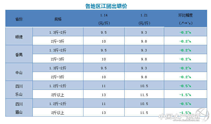 2、本周四川江團由于受到本地收購商到廣西拉魚的影響,大小魚價格與上周相比都有下跌,小魚下跌0.5元/斤,大魚幅度較大,達到1.5元/斤。現在本地存塘量還是挺多的,特別是新魚,下周銷量會慢慢上升,價格暫時穩定。