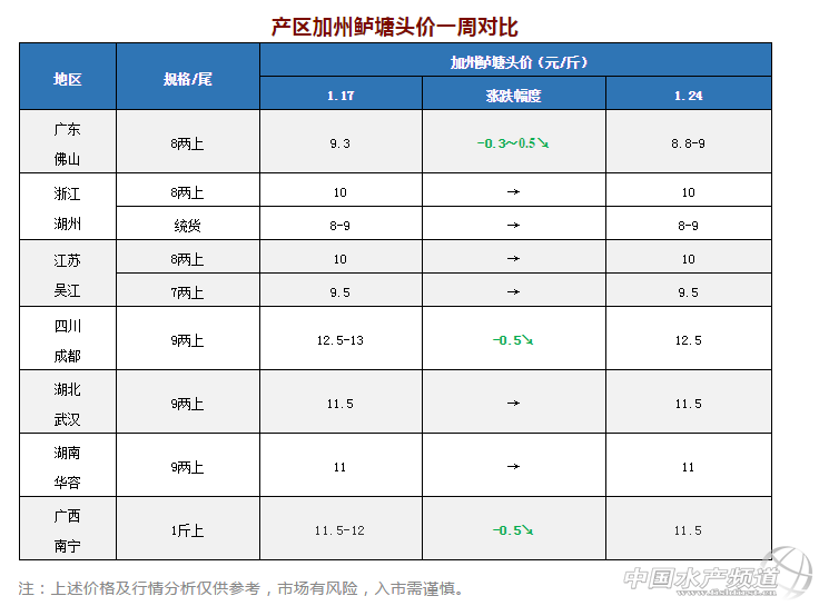 中國水產頻道原創報道, 本周多個產區加州鱸塘頭價出現下滑,其中廣東佛山加州鱸塘頭價一周內下調了3次,跌幅0.3-0.5元/斤,今天8兩上報價8.8-9元/斤;受廣東魚價沖擊市場影響,四川成都、廣西南寧加州鱸塘頭價分別下跌了0.5元/斤。 目前佛山地區存塘量仍較大,加上魚價持續低迷,本周有部分養戶不再觀望轉而出魚,出魚量相比上周增多,有些養戶還需要排期賣魚。業內人士建議,養戶應理性看待魚價走勢,根據自身情況合理安排時間錯峰出魚,切勿跟風恐慌拋售。 廣東佛山 本周佛山加州鱸塘頭價下調了3次:17日,8兩上價格從9.3元/斤跌至9.2-9.3元/斤,跌幅0.1元/斤;21日,魚價從9.2-9.3元/斤下跌至9元/斤,跌幅0.2-0.3元/斤;今天(24日),魚價再次下調0.2元/斤,8兩上塘頭報價8.8-9元/斤。 目前魚價低迷,手頭上資金寬裕的養戶出魚意愿不高,尤其是南海沙頭區域,當地習慣壓舊魚,現在魚價愿意賣魚的養戶很少。而在其他養殖區域,由于年關將至,部分養戶需要周轉資金來開銷或者還款而選擇出大規格魚,還有部分養戶擔心存塘魚超標或要空塘準備育苗而出魚,近期出魚較為集中,導致魚價走低。 浙江湖州 本周湖州魚價基本持平,8兩上維持在10元/斤,統貨8-9元/斤。湖州養戶多以出統貨規格為主,實際成交價看炮頭大小及整塘魚成數。年關將至,部分養戶為周轉資金開銷或還飼料款而出魚,出魚量有所增大,市場需求能夠滿足。 江蘇吳江 吳江加州鱸塘頭價已經維穩了將近50天,7兩上報價9.5元/斤,8兩上10元/斤,目前吳江資金寬裕的養戶都不愿意出魚,加上當地有存魚等到夏天再賣的習慣,本地出魚量少。流通商多到周邊的湖州地區收魚,預計近期魚價以持穩為主。 四川成都 本周成都加州鱸塘頭價下跌了0.5元/斤,今天9兩上報價12.5元/斤左右。受廣東魚沖擊市場影響,成都本地魚銷量有所減少,魚價下滑。目前廣東和四川兩地鱸魚差價較大,當地流通商到廣東收魚增多。 湖北武漢 本周武漢加州鱸塘頭價變動不大,廣東鱸魚拉到武漢市場的批發價比本地魚低,對本地鱸魚的銷量有一定影響,當地流通商在塘口9兩上抓起11.5元/斤左右,但本地養戶出魚積極性不高。 湖南華容 華容9兩上加州鱸一周持穩在11元/斤左右,目前魚價養戶出魚積極性不高,想等夏天價格較好時再出魚,本地出魚量少。 廣西南寧 受廣東魚價下跌影響,本周南寧加州鱸塘頭價下滑了0.5元/斤,今天報價9兩上11元/斤,1斤以上11.5元/斤,F在南寧達上市規格的存魚較少,養戶出魚意愿不大,流通商多到廣東收魚。 |