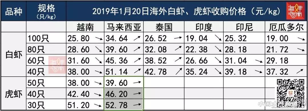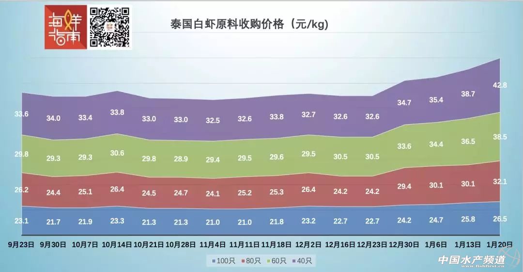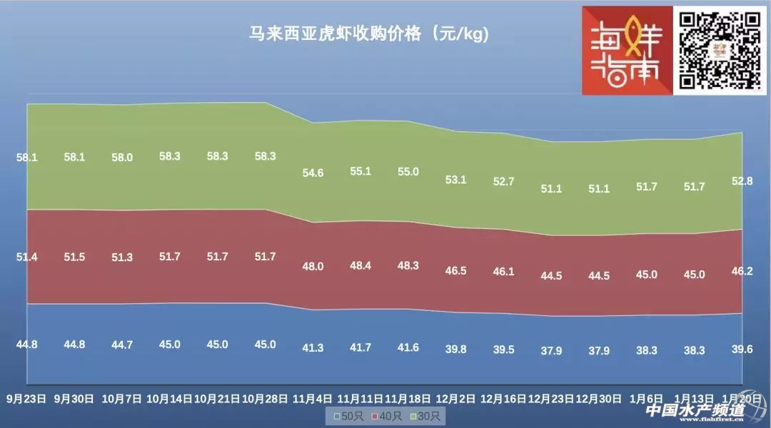 中國水產頻道原創報道, 文/圖 海鮮指南(seafood-guide) 張麗麗、陳磊 海外白蝦原料收購價格 本期(1月20日),泰國、馬來西亞白蝦收購價格繼續上漲,已連續升價一個月;印度、越南價格下跌明顯;厄瓜多爾、印尼漲跌幅度相對較小。 筆者分析:東南亞產區如泰國、馬來西亞等地白蝦收購價格大漲,主要是因為中國市場目前的厄瓜多爾白蝦現貨庫存已經無法滿足市場需求,但期貨又來不及趕在節前到港。因此,國內進口商轉為就近采購,從泰國馬來西亞等產地加緊補貨。相對集中的訂單推高了泰國、馬來西亞等地的原料蝦價。 漲跌詳情如下圖: 注:以上產品為當地蝦類的塘頭收購價,匯率按當地貨幣實時兌換人民幣計算 各產區原料蝦具體漲跌情況如下: 泰國原料蝦顯著上揚,已連漲四周,至全年最高價 1月20日,相較于上一周,泰國原料蝦價格繼續大幅上揚,從下圖可以看出蝦價已經連續上漲一個月。100只/kg原料蝦漲幅為0.7元/kg,80只/kg漲幅為1元/kg、60只/kg漲幅為2元/kg、40只/kg漲幅高達4.1元/kg,突破40元大關漲至全年最高價。 9月23日至1月20日泰國白蝦原料收購價格走勢(來源:海鮮指南) 厄瓜多爾白蝦原料小規格下滑、大規格上漲 1月20日,相較于上一周,厄瓜多爾白蝦小規格下跌、大規格上漲。100只/kg原料蝦降幅為0.2元/kg,80只/kg降幅為0.3元/kg、60只/kg漲幅為0.4元/kg、40只/kg漲幅最大為1.6元/kg。 9月23日至1月20日厄瓜多爾白蝦原料收購價格走勢(來源:海鮮指南) 越南原料蝦價下跌 1月20日,相較于上一周,越南原料蝦價明顯下跌。100只/kg原料蝦降幅為0.8元/kg,80只/kg降幅為1元/kg、60只/kg降幅為1元/kg、40只/kg降幅較小為0.4元/kg。 9月23日至1月20日越南白蝦原料收購價格走勢(來源:海鮮指南) 印度白蝦收購價格明顯下跌,40規格跌幅最大 1月20日,相較于上一周,印度原料蝦明顯下跌,100只/kg降幅為1.7元/kg,80只/kg的價格下滑降幅為1.3元/kg、60只/kg降幅為1.9元/公斤、40只/kg降幅高達3.3元/kg。 9月23日至1月20日印度白蝦原料收購價格走勢(來源:海鮮指南) 印尼大規格蝦價上漲 從下圖可以看出,1月20日,印尼白蝦收購價格相對平穩,各規格回落幅度不超過0.2元/kg。 9月23日至1月20日印尼白蝦原料收購價格走勢(來源:海鮮指南) 馬來西亞原料蝦價格大漲,平均漲幅3.6-3.8元 1月20日,馬來西亞各規格原料蝦價格大漲。100只/kg原料蝦漲幅為3.8元/kg;80只/kg漲幅為3.8元/kg;60只/kg漲幅為3.7元/kg;40只/kg漲幅為3.6元/kg,突破50元/kg大關,漲至全年最高價。 9月23日至1月20日馬來西亞白蝦原料收購價格走勢(來源:海鮮指南) 海外虎蝦收購價格行情 1月20日,越南虎蝦(草蝦)價格相對平穩,略有回落,降幅在0.4-0.6元/kg。 9月23日至1月20日越南虎蝦(草蝦)收購價格走勢(來源:海鮮指南) 1月20日,馬來西亞虎蝦(草蝦)價格回升,50只/kg漲幅為1.3元/kg、40只/kg漲幅為1.2元/kg、40只/kg漲幅為1.1元/kg。 9月23日至1月20日馬來西亞虎蝦(草蝦)收購價格走勢(來源:海鮮指南) |