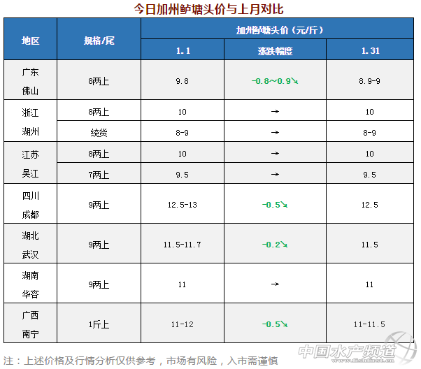 中國水產(chǎn)頻道原創(chuàng)報道,三分鐘掌握各產(chǎn)區(qū)加州鱸1月行情 文/圖 水產(chǎn)前沿 李曉欣 本月產(chǎn)區(qū)加州鱸塘頭價穩(wěn)中有降,其中廣東鱸魚價格經(jīng)歷6次小幅下調(diào),跌幅0.8-0.9元/斤;受廣東魚價影響,四川成都、廣西南寧魚價分別回落了0.5元/斤;其他產(chǎn)區(qū)價格基本保持平穩(wěn)。臨近春節(jié),近幾天產(chǎn)區(qū)加州鱸銷量相比之前都有不同程度的增幅,行情有所好轉(zhuǎn)。 1月各產(chǎn)區(qū)行情簡析 廣東佛山:6次小幅下調(diào),臨近春節(jié)銷量上漲明顯 1月,佛山加州鱸塘頭價經(jīng)歷了6次小幅下滑,今天8兩上塘頭報價8.9-9元/斤左右,1斤上捉9元/斤,相比月初價格9.8元/斤下跌了0.8-0.9元/斤。去年同期佛山8兩上報價10.4元/斤,目前魚價同比去年低了1.4-1.5元/斤。 魚價低迷,佛山當?shù)厥诸^上資金寬裕的養(yǎng)戶出魚意愿不高,尤其是南海沙頭區(qū)域,當?shù)亓?xí)慣壓舊魚,愿意賣魚的養(yǎng)戶較少。而在其他養(yǎng)殖區(qū)域,由于臨近春節(jié),部分養(yǎng)戶需要周轉(zhuǎn)資金來開銷或者還款而選擇出大規(guī)格魚,還有部分養(yǎng)戶擔心存塘魚超標或要空塘準備育苗而出魚,本月出魚較為集中,導(dǎo)致魚價走低。現(xiàn)在距離春節(jié)僅剩幾天時間,近幾天是出春節(jié)的貨量,市場銷量上升明顯,行情有所好轉(zhuǎn)。 浙江湖州:魚價企穩(wěn),近期大魚銷量走俏 本月湖州加州鱸塘頭價基本持穩(wěn),8兩上10元/斤,統(tǒng)貨8-9元/斤,實際成交價看炮頭大小及整塘魚成數(shù)。目前湖州存塘量還是比較大,養(yǎng)戶多以出統(tǒng)貨規(guī)格為主。臨近過年,這幾天湖州銷量增大,大規(guī)格魚的市場銷量較好,小魚沒市場,拉網(wǎng)時如果大魚占比少的還可能會放網(wǎng),而整塘魚大規(guī)格占比高、條形好、炮頭大的塘頭價相比打樣有0.1-0.3元/斤的上浮。 江蘇吳江:本地出魚少,魚價持穩(wěn)近3月 吳江加州鱸塘頭價已經(jīng)維穩(wěn)了接近3個月,7兩上報價9.5元/斤,8兩上10元/斤。魚價低迷,加上水溫低,吳江養(yǎng)戶出魚積極性不高,大多想存魚等到夏天再賣,本地出魚量少,流通商多到周邊的湖州地區(qū)收魚。年關(guān)將至,近幾天本地出魚量相比上周有所增大,預(yù)計短期內(nèi)魚價還是比較平穩(wěn)。 四川成都:受廣東魚影響,回落0.5元/斤 受廣東魚價影響,本月成都加州鱸塘頭價有所回落,從月初的12.5-13元/斤下跌至目前的12.5元/斤,跌幅0.5元/斤。前期受氣溫影響,流通商拉外地魚存在一定風險,回流到本地拉魚有所增多,近期廣東魚和本地魚差價拉大,本地魚價受到?jīng)_擊。現(xiàn)在成都當?shù)厮疁氐停由萧~價波動,部分養(yǎng)殖戶出魚積極性不高。 湖北武漢:漲了又跌,臨近春節(jié)走量翻番 本月上旬,受寒潮降雪影響,廣東鱸魚運輸受阻,武漢周邊區(qū)域市場出現(xiàn)斷貨現(xiàn)象,促使武漢加州鱸塘頭價在持穩(wěn)近兩個月后終于迎來上漲,9兩上報價11.5-12元/斤左右;中旬受廣東魚價影響,塘頭價回落到11.5元/斤。臨近春節(jié),近期武漢走量相比平時幾乎翻番,加上春運期間交通要道堵塞,部分廣東魚進入武漢市場受阻,預(yù)計后市價格或有所波動。 湖南華容:本地走量少,養(yǎng)戶出魚意愿不高 本月華容9兩上加州鱸塘頭價持穩(wěn)在11元/斤左右,由于魚價未達預(yù)期,加上低溫天氣,養(yǎng)戶出魚積極性不高,想等夏天價格較好時再出魚,本地出魚量少。近幾天受春節(jié)消費帶動,當?shù)刈吡柯杂性黾樱傮w走量依舊不大,預(yù)計短期內(nèi)魚價還是以企穩(wěn)為主。 廣西南寧:受廣東魚價沖擊,下滑0.5元/斤 本月南寧1斤上加州鱸塘頭價有所下滑,今天報價11-11.5元/斤,相比月初價格11-12元/斤跌了0.5元/斤,主要是受廣東魚價下跌影響。南寧本地達上市規(guī)格的存魚量還是比較少,養(yǎng)戶出魚意愿不高,市場以廣東魚為主,流通商多到廣東收魚。這幾天臨近春節(jié),南寧本地收魚量有所增加,后市魚價或有所波動。 |