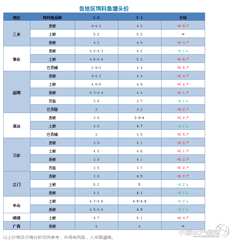 中國水產(chǎn)頻道原創(chuàng)報道,預計隨著這輪年前出魚高峰結(jié)束,年后鱖魚價格有望慢慢回升。 文/圖 水產(chǎn)前沿 李靜 這兩日,隨著春節(jié)臨近,各地標桂銷量明顯增長,鱖魚行情現(xiàn)回暖趨勢。 各產(chǎn)區(qū)鱖魚價格大致如下:廣東標桂30-31元/斤左右,中桂一到兩成小魚統(tǒng)貨28-29元/斤左右,中桂兩成、小魚一成27.5-28元/斤左右,中桂三成27-27.5元/斤左右;廣西標桂32元/斤左右;江蘇標桂30元/斤左右,統(tǒng)貨25-27元/斤左右;湖北標桂30元/斤左右,統(tǒng)貨26-27元/斤左右;江西標桂28元/斤左右,統(tǒng)貨26-27元/斤左右;湖南標桂28.5元/斤左右,統(tǒng)貨26.5元/斤左右;安徽標桂30-30.5元/斤左右,統(tǒng)貨28-29元/斤左右;山東標桂28-29元/斤左右。(以上價格僅供參考) 2018年下半年,廣東鱖魚價格漲跌起伏不定,坐了幾輪過山車,但整體價格高于2017年同期,直到2019年1月,市場偏大魚滯銷,又趕上養(yǎng)殖戶扎堆出魚,鱖魚價格不漲反跌至28-29元/斤,比去年同期統(tǒng)貨30.5元/斤低了2.5元/斤左右。但預計隨著這輪年前出魚高峰結(jié)束,年后鱖魚價格或許會慢慢回升。 圖:紅色為近半年(8月-1月)廣東鱖魚價格走勢,藍色為去年同期價格走勢 1月份,隨著氣溫回升,大部分地區(qū)的餌料魚價格漲勢明顯,最高漲0.7元/斤。三水麥鯪和泰鯪分別漲了0.3-0.5元/斤;肇慶土鯪、巴西雕約漲了0.5-0.6元/斤;高明麥鯪、土鯪、泰鯪、巴西雕分別漲了0.1-0.4元/斤;清遠麥鯪、巴西雕漲了0.2-0.5元/斤;花都麥鯪、土鯪、泰鯪等分別漲了0.1-0.2元/斤;江門麥鯪漲了0.7元/斤左右;順德土鯪漲了0.3元/斤左右。 |