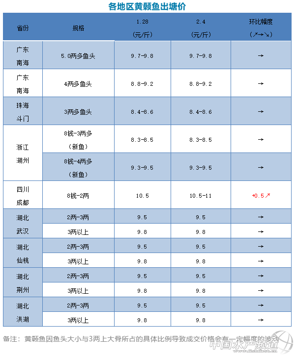 中國水產頻道原創報道, 文/圖 何氏水產、水產前沿 李靜 黃顙魚 1、 本周廣東黃顙魚價格與上周差不多,只是魚頭有偏差,地域不同價格會相差一點,銷量比上周上漲很多,由于現在存塘量還能滿足市場需求,價格暫時還是漲不上去。本周銷量不多,部分城市不上貨,價格暫時穩定。 2、 本周浙江湖州價格與上周差不多,3兩多魚頭還是8.3-8.5元/斤,4兩多魚頭成交價還是9.3-9.5元/斤左右,5兩多6兩的價格還是9.8元/斤左右,上周上春節的量,銷量上漲,接下來預計價格穩定,銷量平穩。 3、四川成都黃顙魚價格跟銷量有關,魚量緊張,價格要11元/斤,魚能滿足市場,價格就是10.5元/斤,銷量比上周多。接下來價格還會在10.5-11元/斤左右波動。 【關鍵字】:黃顙魚 塘頭價 水產養殖 |