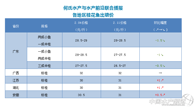 中國水產頻道原創報道, 文|圖 何氏水產 水產前沿 李靜 1、春節期間,全國桂魚價格先漲后跌,廣東桂魚年初一初二開塘價格上漲,標桂多的魚要開到29元/斤多一點,初三后價格慢慢回落,到今天8成標桂的魚最高開塘價也要29元/斤,偏大魚價格下跌幅度大,6成中桂開塘價只要25元/斤多一些。春節期間,標桂市場行情異常好,需要量大,江蘇、湖北、安徽三大產區量價齊升,價格上漲了0.5-1元/斤。 2、廣東桂魚本周價格與上周相比基本都下跌了0.5-1元/斤,現在最好規格的魚價格最高訂到29元/斤,現在大部分成交價在27-28.5元/斤為主,主要看實際規格和出魚時間來定價。上周是春節期間,聚餐與灑席比較多,標桂需要量更大,中大桂市場行情差,導致中桂出貨少,標桂缺貨,兩者差價越來越大。現在存塘量還是以偏大魚為主,標桂多的存塘不多,導致現在推出市場的魚都是以偏大魚為主,收購商由于手上囤積大魚比較多,都不敢開偏大的魚。預測接下來開魚價格跨度比較大,由實際規格來決定,銷量慢慢恢復到平日水平。 3、春節期間,外省標桂市場行情也是異常好,需要量大,江蘇、湖北、安徽三大產區量價齊升,價格上漲了0.5-1元/斤。廣西價格與上周一樣,銷量比上周稍微下滑了一些。 |