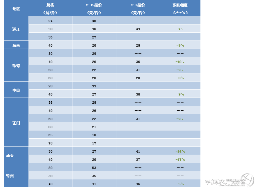 文/ 水產前沿 植銀素 各產區白對蝦一周價格分析 中國水產頻道原創報道,湛江:今日蝦價24頭40元/斤,30頭36元/斤,36頭27元/斤,目前對蝦存塘量不多,交易相對年前減少。 海南:40頭20元/斤,海南地區存塘量不足,但是蝦價爛市,養殖戶表示價格幾乎接近成本價,交易量不高,養殖放苗積極性也不高。 中山:28頭33元/斤,40頭27元/斤。近期氣溫較高,養殖情況良好,對蝦長速較快。 江門:36頭29元/斤,40頭26元/斤,50頭22元/斤,60頭21元/斤,65支18元/斤,70條17元/斤。江門地區目前存塘量一般,價格較低,有養殖戶表示今日有10輛以上蝦車前來收蝦。 珠海:30頭29元/斤,40頭26元/斤,50頭22元/斤,60頭20元/斤。珠海目前貨源較充足。 汕頭:本周蝦價30頭27元/斤,40頭20元/斤。汕頭地區目前存塘量較多,但是近期交易量不大,價格低迷。 漳州:本周蝦價20頭53元/斤,30頭35元/斤,40頭31元/斤。蝦存塘量較少。 上海地區:上海市場已經結束。 浙江紹興:紹興市場已經結束。 ※上述報價可能會因區域、規格、品質和時間等因素的不同而會產生差異,在此僅供參考。 【關鍵字】:對蝦 蝦價 水產養殖 |