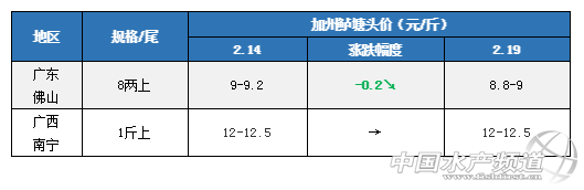 | 中國水產頻道原創報道, 文/圖 水產前沿 李曉欣 今天是元宵佳節,加州鱸塘頭價卻沒有應節上漲。今天產區加州鱸塘頭價基本持穩,廣東佛山魚價回落了0.2元/斤,主要是隨著氣溫回升,近期佛山清塘準備育苗的養戶增多,出魚較為集中,導致魚價走低。隨著春節行情過去,各地銷量恢復正常水平,元宵前銷量亦沒有明顯上升,多地行情持穩。業內人士建議養戶根據自身情況合理安排時間錯峰出魚,避免集中上市。 產區加州鱸塘頭價及行情簡析 華南地區 廣東佛山:今天佛山8兩上報價8.8元/斤,1斤上報價9元/斤,相比14日價格下跌了0.2元/斤。據悉,目前佛山區域超5成養戶已經投苗,近期順德杏壇和外圍區域很多養戶在清塘準備育苗,7兩、8兩上的魚大量集中上市,導致魚價走低。 廣西南寧:南寧1斤上加州鱸塘頭價維持在12-12.5元/斤,當地達上市規格的存魚量還是比較少,養戶出魚意愿不高,當地養戶多到廣東地區拉魚。 華東地區 浙江湖州:今天湖州8兩上加州鱸報價10元/斤,統貨價格8-9元/斤,行情變動不大,沒炮頭的中子魚較不暢銷。 江蘇吳江:吳江7兩上報價9.5元/斤,8兩上10元/斤,9兩上10.5元/斤。目前吳江加州鱸存塘量在5成以上,養戶出魚積極性一般,流通商多到周邊的湖州地區或南下廣東收魚。 華中地區 湖北武漢:武漢9兩上加州鱸塘頭價維持在11.5-12元/斤左右,近期受雨雪天氣影響,當地養戶出魚積極性不高,預計后市魚價或會小幅上漲。 湖南華容:今天華容9兩上加州鱸報價11-11.5元/斤,由于魚價未達預期,當地養戶出魚意愿不大,元宵前當地走量沒有較大增加。 西南地區 四川成都:今天成都9兩上加州鱸塘頭報價12元/斤,價格不變。近期氣溫回升,當地部分養戶想趕在產卵季前再出一網魚,出魚積極性較高。 |