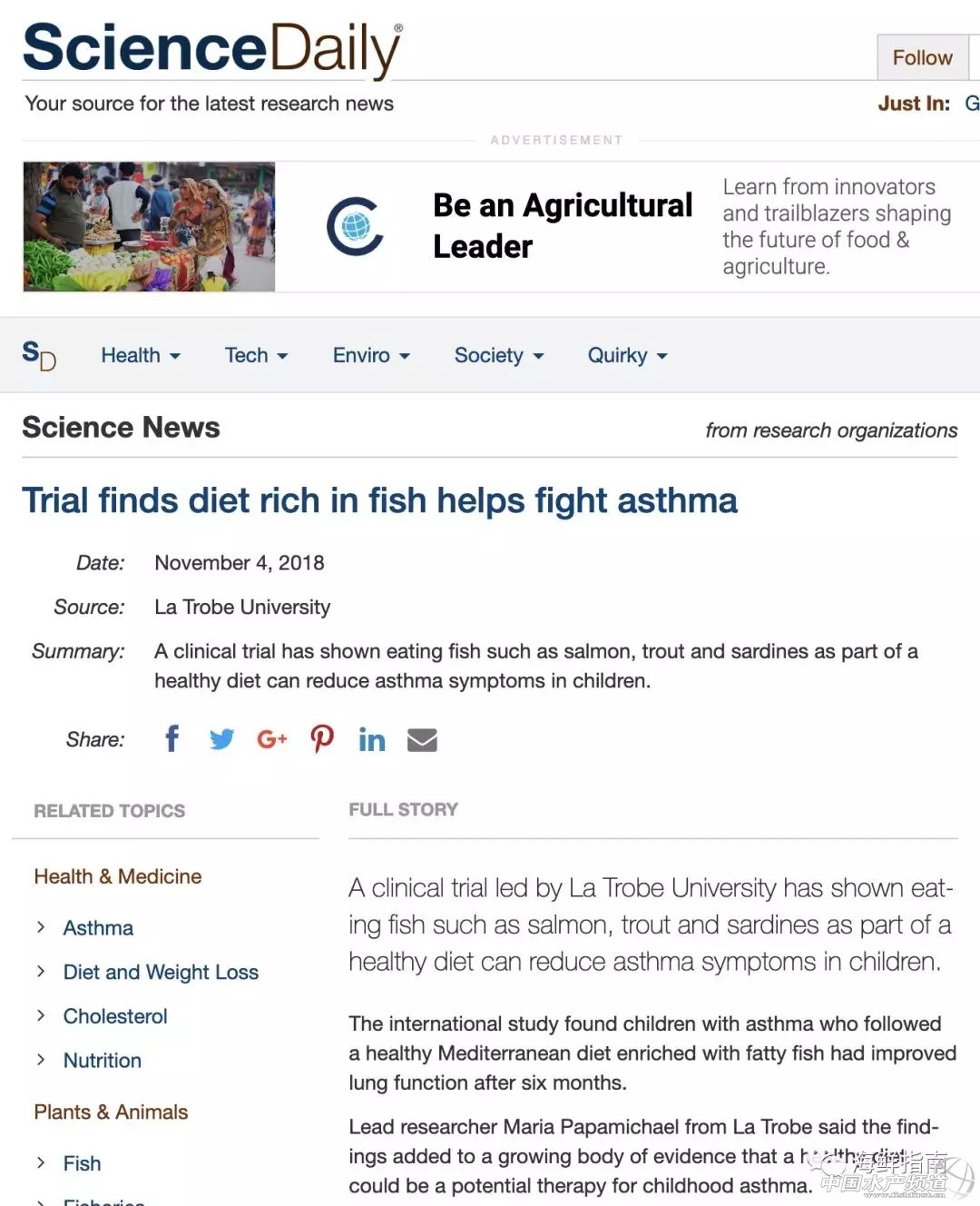 中國水產頻道原創報道, 一項臨床試驗表明,食用魚類如鮭魚,鱒魚和沙丁魚作為健康飲食的一部分可以減輕兒童的哮喘癥狀。 翻譯/ 海鮮指南(seafood-guide)張麗麗 據ScienceDaily報道,近日,拉籌伯大學(La Trobe University)領導的一項臨床試驗表明:食用鮭魚、鱒魚和沙丁魚等富含omega-3脂肪酸的海魚作為健康飲食的一部分可以減輕兒童的哮喘癥狀。 國際研究發現,多吃富含脂肪的海魚的哮喘兒童,在采用這種健康地中海飲食模式的六個月后,其肺功能可以得到明顯改善。 來自La Trobe的首席研究員Maria Papamichael表示,這一發現增加了越來越多的證據表明健康飲食可能是兒童哮喘的潛在療法。 “我們已經知道,高脂肪、高糖和高鹽的飲食可以影響兒童哮喘的發展和進展,現在我們有證據表明,通過多吃海魚這種健康飲食方式也可以控制哮喘癥狀,”Papamichael女士說。 “高脂肪海魚富含Omega-3脂肪酸,具有抗炎作用。我們的研究表明,每周吃兩次海魚可以顯著減少哮喘患兒的肺部炎癥! 聯合研究員和拉籌伯聯合健康學院院長Catherine Itsiopoulos教授表示,結果很有希望。 “遵循傳統的地中海飲食,植物性食物含量高,富含油脂的魚類可能是一種簡單、安全、有效地減少兒童哮喘癥狀的方法,”Itsiopoulos教授說。 來自La Trobe心理學和公共衛生學院的Bircan Erbas副教授是哮喘和過敏專家,他共同監督了這項試驗。 “哮喘是年輕人中最常見的呼吸道疾病,也是兒童住院和急診的主要原因之一,”埃爾巴斯副教授說。 “不幸的是,全球的哮喘發病率仍然很高。我們必須確定可以與常規哮喘藥物一起使用的新療法! 該臨床試驗涉及來自希臘雅典的64名兒童,他們年齡在5至12歲之間,患有輕度哮喘。來自澳大利亞和希臘的研究人員將這些孩子分成兩組,并指示大約一半的人每周吃兩餐煮熟的富含脂肪的魚(至少150克)作為希臘地中海飲食的一部分,為期六個月。剩下的孩子遵循正常飲食。 在試驗結束時,他們發現吃魚的孩子支氣管炎癥已經減少了14個單位。 相關閱讀: 每周都吃海魚!2019全球最佳飲食榜出爐——富含海魚的地中海飲食模式奪冠 來源:科普中國、健康時報 1月2日,美國“新聞和世界報道"(U.S. News & World Report)網站公布了2019年最佳飲食排名榜單,連續8年蟬聯全球健康飲食首位的得舒飲食掉到了第二位,地中海飲食(Mediterranean Diet)首次獨享第一寶座。以下是在41種飲食法中排名前十位的飲食法: 《美國新聞與世界報道》官網公布的2019最佳飲食排行榜 第一名:Mediterranean Diet(地中海飲食) 第二名:DASH Diet(得舒飲食) 第三名:The Flexitarian Diet(彈性飲食) 第四名(并列):MIND Diet(超體飲食) 第四名(并列):WW (Weight Watchers) Diet(體重觀察者飲食) 第六名(并列):Mayo Clinic Diet(梅奧診所飲食) 第六名(并列):Volumetrics Diet(容量測定飲食) 第八名:TLC Diet(薄層色譜法膳食) 第九名(并列):Nordic Diet(北歐飲食) 第九名(并列):Ornish Diet(歐尼許飲食) 【地中海飲食】獲得最佳飲食的榜首,除了奪得整體“最佳飲食”稱號,地中海飲食還被評為“最適合糖尿病患者”、“最有益于心臟健康”、“最健康”、“最容易遵從”的飲食等。 地中海飲食到底好在哪? “地中海飲食”,泛指地中海地區人民的飲食,包括希臘、西班牙、法國和意大利南部等處于地中海沿岸的南歐各國。1945年由美國人 Ancel Keys 正式研究整合成一套飲食方式提出。 現也用“地中海式飲食”代指有利于健康的,簡單、清淡以及富含營養的飲食。 早在1990年,世界衛生組織就提倡地中海式飲食;2010年11月又被聯合國教科文組織列入了西班牙、希臘、意大利和摩洛哥聯合擁有的非物質文化遺產。 從目前研究來看,按照地中海飲食來吃,的確對健康有好處! 根據聯合國的數據,西班牙、法國、意大利、希臘等地中海國家居民期望壽命都比較高,達80歲左右。 一項由意大利科學家負責,有150萬名參加者的研究表明,采取地中海飲食可顯著改善健康狀況,降低心血管疾病和癌癥的死亡率,并且使帕金森和阿爾茨海默癥的發病率降低13%。 地中海飲食有八大特點 一、優化主食 地中海飲食強調控制主食的攝入,并且攝入的主食也是以粗雜糧為主,像燕麥、薏米、糙米、黑米、玉米等。 這些粗加工的谷物食品富含膳食纖維,也富含B族維生素和微量元素,對控制體重、調節胃腸道、穩定血糖、增加免疫力等均有幫助! 二、豐富的蔬菜水果 每天攝入大量的新鮮的應季蔬菜,并且烹調方式非常簡單,多采用生吃的方式,或者輕微的用水燙一下,再簡單涼拌。 紅色的有番茄、小辣椒;黃色的有胡蘿卜、橘子;白色的有大蒜、菌藻類;紫色的有茄子、紫蔥頭等。 三、豐富的魚蝦海鮮 由于地中海地區沿海,所以經常食用深海魚。魚蝦海鮮可以給人體提供大量的優質蛋白質,海魚中含有很多的ω-3脂肪酸,有助于抑制動脈粥樣硬化。建議養成每周吃2~3次深海魚的習慣,如沙丁魚、鯖魚、鯡魚、鮭魚等! 四、少紅肉、少加工食物 相比海鮮而言,紅肉類脂肪含量較高,并以飽和脂肪為主,過多攝入不利心腦血管疾病、肥胖等疾病的預防。 也很少吃加工類食品,如香腸、培根、火腿等。 五、適量奶制品及蛋類 每日適量吃些奶制品也是地中海膳食的一個特點,且品種豐富,如牛奶、酸奶、奶酪等。奶類除含豐富的優質蛋白質和維生素外,含鈣量較高。 地中海飲食并不強調過多的吃蛋類,因為蛋黃里膽固醇比較