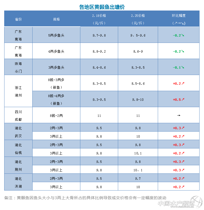 | 中國水產頻道原創報道, 文/圖 何氏水產、水產前沿 李靜 真是虧到心極痛!魚市行情陷跌價風暴,持續爛市。不但大宗養殖魚類如草魚、鯽魚、鯉魚價格暴跌,特種魚類如鱖魚、加州鱸、生魚等跌得更兇猛。在上周量價齊跌的基礎上,本周鱖魚最高再跌2元/斤,加州鱸最高再跌1元/斤,不但價格大降,兩條魚的銷量也呈大幅下跌。生魚銷量稍穩定,但價格仍止不住地跌,絕大部分人跌破成本。 不少業內人士無奈地驚嘆甚至震驚,全國大江南北魚價幾近全線暴跌,涉及品種之多持續時間之久下跌幅度之大,為20多年來罕見的現象。而何止魚價才能回暖反彈?目前,雖然廣東地區黃顙魚仍持續低迷行情,量價還在跌,但浙江、湖北地區市場已出現回暖,價格有所上揚,最高漲了0.5元/斤。另外生魚銷量企穩,上周部分地區對蝦價格現喜人上漲,如汕頭地區一周內漲了8元/斤,中山地區最高漲3元/斤,還有湛江也小幅漲。 那么,這些品種的表現是不是預示低迷已久的行情要回暖了呢?讓我們一起祈愿吧! 黃顙魚 1、 廣東黃顙魚由于市場行情不好,銷量下降,本周開塘價與上周差不多,總體價格下跌了0.1-0.2元/斤,現在黃顙魚的存塘量還是以4兩多到5兩多的魚頭為主,銷量總體也是以這種規格為主,預測接下來價格變化不大,養殖黃顙魚總體利潤空間不大,養戶的養殖積極性不強。 2、春節行情過后,浙江湖州黃顙魚銷量也慢慢下降,由于現在價格不高,養戶出魚積極性不高,導致本周價格與上周相比有0.2-0.5元/斤的上漲,3兩多魚頭還是8.5-8.6元/斤,4兩多魚頭成交價還是9.8-10元/斤左右,5兩多6兩的價格還是10.3元/斤左右。接下來價格變化不大,銷量平穩。 3、 四川成都黃顙魚本周價格基本都是11元/斤,銷量下降,湖北地區由于現在存塘量不大,價格太便宜部分養戶選擇不出魚,當地價格上漲了0.2-0.3元/斤,銷量不多。 |