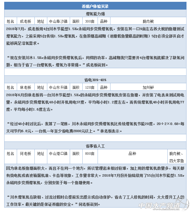 | 中國(guó)水產(chǎn)頻道獨(dú)家報(bào)道, 文/ 水產(chǎn)前沿 李釩 圖/ 川木智能設(shè)備江蘇有限公司 “十年前我就說(shuō)過(guò),增氧機(jī)早就應(yīng)該更新?lián)Q代了。”一位養(yǎng)殖戶激動(dòng)地說(shuō)到。 不少業(yè)內(nèi)人士詬病,說(shuō)傳統(tǒng)增氧機(jī)幾十年如一日沒(méi)有太大的創(chuàng)新與進(jìn)步,費(fèi)電、燒機(jī)、常維修、難搬運(yùn)、難拆卸已成為養(yǎng)殖戶的痛點(diǎn)。維修后功率增加,耗電量增大,壽命縮短,給客戶帶來(lái)高額的養(yǎng)殖成本,更嚴(yán)重還會(huì)造成池塘缺氧,死魚、死蝦等損失。 增氧機(jī)作為水產(chǎn)養(yǎng)殖中應(yīng)用最為廣泛的設(shè)備,在科技日新月異的今天,確實(shí)有點(diǎn)跟不上步伐了。 “川木變頻增氧機(jī)將以省電30%以上、不燒機(jī)、電壓下降,增氧量不變、不加油免維護(hù)、以換代修等多項(xiàng)優(yōu)勢(shì)開(kāi)啟增氧機(jī)新時(shí)代,一場(chǎng)養(yǎng)殖端智能產(chǎn)業(yè)革命一觸即發(fā)。”川木智能設(shè)備江蘇有限公司(簡(jiǎn)稱川木公司)創(chuàng)始人兼董事長(zhǎng)楊建華說(shuō)到。 “一經(jīng)面市,我們已經(jīng)預(yù)售出2000多臺(tái),這是一個(gè)不錯(cuò)的開(kāi)始。”總經(jīng)理曾朝棟高興地表示。 這臺(tái)增氧機(jī),會(huì)給行業(yè)帶來(lái)什么驚喜!? 川木公司研發(fā)的永磁同步變頻增氧機(jī) 跨界來(lái)襲,降維出擊顛覆傳統(tǒng) 水產(chǎn)前沿:川木公司跨界進(jìn)入水產(chǎn)養(yǎng)殖設(shè)備領(lǐng)域,并不為人熟知,請(qǐng)您介紹一下公司的背景。 楊建華:川木智能設(shè)備江蘇有限公司于2008年在江蘇南通注冊(cè)成立,至今已有十年歷史,是國(guó)內(nèi)一家大型智能化設(shè)備制造商。目前川木公司有兩個(gè)事業(yè)部,一個(gè)是快遞分選設(shè)備事業(yè)部,主要負(fù)責(zé)研發(fā)和生產(chǎn)制造快遞包裹分選系統(tǒng)、裝包系統(tǒng);另一個(gè)是智能漁業(yè)設(shè)備事業(yè)部,主要負(fù)責(zé)研發(fā)和生產(chǎn)制造變頻增氧機(jī),水車等一系列節(jié)能型智能漁業(yè)設(shè)備。 水產(chǎn)前沿:您是做技術(shù)出身的,作為公司的創(chuàng)始人之一,為什么想到要進(jìn)軍水產(chǎn)養(yǎng)殖板塊? 楊建華:我是一名技術(shù)控,一直喜歡鉆研創(chuàng)新。1987年,我就創(chuàng)辦了第一家電子類企業(yè),三十多年來(lái)一直從事技術(shù)研發(fā)和企業(yè)管理工作。2009年,由我們團(tuán)隊(duì)完全自主研發(fā)的大型快遞分選設(shè)備,集成了變頻智能控制、高端機(jī)械傳動(dòng)、精準(zhǔn)遠(yuǎn)程通信等諸多系統(tǒng),小時(shí)分選量2萬(wàn)件以上,日分選量20萬(wàn)件以上,出錯(cuò)率小于萬(wàn)分之三,節(jié)省60%的人工,降本增效非常明顯,目前已成為各快遞集散中心首選裝備。 這就是技術(shù)創(chuàng)新帶來(lái)的進(jìn)步。我始終相信,唯有技術(shù)創(chuàng)新,才是未來(lái)行業(yè)以及企業(yè)發(fā)展的必由之路,水產(chǎn)養(yǎng)殖業(yè)也不例外。水產(chǎn)養(yǎng)殖業(yè)作為傳統(tǒng)農(nóng)業(yè),正處于快速的轉(zhuǎn)型升級(jí)期,發(fā)展?jié)摿κ志薮蟆N覀冊(cè)谧冾l機(jī)和人工智能方面有深厚的沉淀,公司開(kāi)發(fā)的節(jié)能型變頻增氧機(jī)一年來(lái)已在養(yǎng)殖戶處小范圍批量試用(養(yǎng)殖戶體驗(yàn)實(shí)錄附后),期間經(jīng)歷上千次的測(cè)試和調(diào)整,收集了大量客戶使用數(shù)據(jù),現(xiàn)已批量面市,相信一定能給水產(chǎn)業(yè)帶來(lái)耳目一新的體驗(yàn)。 川木智能設(shè)備江蘇有限公司完全自主研發(fā)的大型快遞分選設(shè)備 美國(guó)芯片,智能算法 水產(chǎn)前沿:變頻增氧機(jī)是近年的熱門產(chǎn)品,各大廠商都在有計(jì)劃的布局,那川木推出的永磁同步變頻增氧機(jī)最大的競(jìng)爭(zhēng)優(yōu)勢(shì)在哪? 楊建華:我們是技術(shù)研發(fā)型的企業(yè),技術(shù)創(chuàng)新就是我們最大的競(jìng)爭(zhēng)力。旗下企業(yè)被認(rèn)定為南通市高新技術(shù)企業(yè),目前共有各類專利103項(xiàng),其中快遞分選設(shè)備領(lǐng)域有48項(xiàng),增氧機(jī)領(lǐng)域也已經(jīng)申請(qǐng)了10項(xiàng)專利。 概括來(lái)說(shuō),我們研發(fā)的永磁同步變頻增氧機(jī)具有:1、永磁同步電機(jī);2、省電30%以上;3、恒速增氧,電壓下降,(變頻調(diào)控)增氧量不變;4、不燒機(jī),工作異常檢測(cè),缺相過(guò)流過(guò)載過(guò)熱保護(hù);5、不加油免維護(hù)五大優(yōu)勢(shì),這是傳統(tǒng)增氧機(jī)無(wú)法比擬的,功能更強(qiáng)大,客戶使用體驗(yàn)更好。 我們最明顯的優(yōu)勢(shì)就是品質(zhì)穩(wěn)定,功能上始終保持與其他品牌的差異化,只有這樣川木才能贏得客戶贏得市場(chǎng)。養(yǎng)殖戶很辛苦,太不容易,只有能幫助養(yǎng)殖戶省電、省心,提高養(yǎng)殖效益的產(chǎn)品,才是實(shí)實(shí)在在的,別的其他概念沒(méi)用。 水產(chǎn)前沿:省電30%以上,算起來(lái)能省不少成本。 楊建華:我們的節(jié)能型380V1.5Kw變頻增氧機(jī)能夠?qū)崿F(xiàn)省電30%-50%,也就是說(shuō)1臺(tái)增氧機(jī)使用1年比傳統(tǒng)增氧機(jī)省電費(fèi)2000元,一年就能省出一臺(tái)增氧機(jī)了。而增強(qiáng)型3