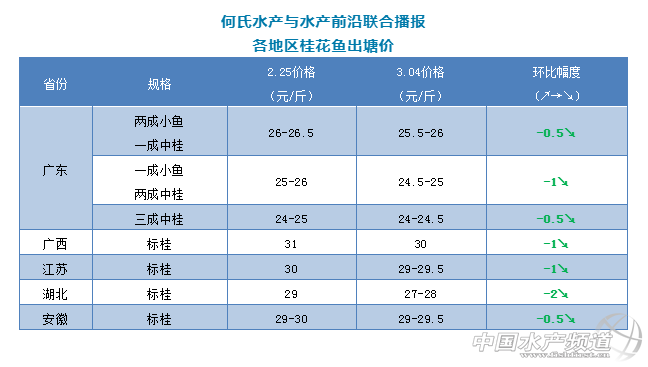 | 中國(guó)水產(chǎn)頻道原創(chuàng)報(bào)道, 文/圖 何氏水產(chǎn)、水產(chǎn)前沿 李靜 全國(guó)桂魚(yú)本周全線(xiàn)下跌,跌幅在0.5-2元/斤,其中廣東桂魚(yú)價(jià)格下跌0.5-1元/斤,廣西、江蘇、湖北、安徽四大產(chǎn)區(qū)標(biāo)桂也下降0.5-2元/斤,銷(xiāo)量比上周稍微下跌了一些。 1.廣東桂魚(yú)本周價(jià)格與上周相比每種規(guī)格都下跌了0.5-1元/斤,規(guī)格越大價(jià)格越便宜。現(xiàn)在最好規(guī)格的魚(yú)(7-8成標(biāo)桂)價(jià)格最高訂到26元/斤,大部分成交價(jià)在24-25元/斤為主,主要看實(shí)際規(guī)格和出魚(yú)時(shí)間來(lái)定價(jià)。現(xiàn)在廣東桂魚(yú)存塘量還是偏大魚(yú)為主,偏小魚(yú)比例不多,現(xiàn)在已經(jīng)進(jìn)入3月份,魚(yú)開(kāi)始產(chǎn)卵,體重會(huì)下降,部分養(yǎng)戶(hù)在加緊時(shí)間出魚(yú),部分養(yǎng)戶(hù)想法不一樣,持觀(guān)望態(tài)度。預(yù)測(cè)接下來(lái)價(jià)格變化不大,銷(xiāo)量持穩(wěn)。 2.廣西、江蘇、湖北、安徽四大主產(chǎn)區(qū)的標(biāo)桂價(jià)格由于市場(chǎng)行情也不好,價(jià)格也下降了0.5-2元/斤,特別是湖北產(chǎn)區(qū),跌幅最大,達(dá)到2元/斤,中大魚(yú)價(jià)格更低,銷(xiāo)量也有小幅下滑。預(yù)計(jì)接下來(lái)價(jià)格和銷(xiāo)量波動(dòng)不會(huì)太大。 |