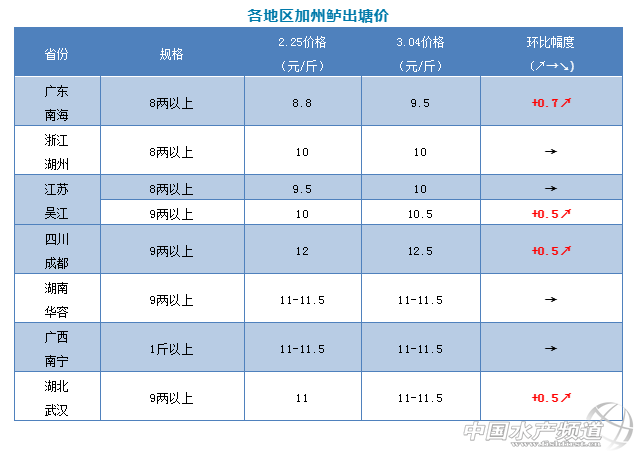 2、浙江湖州新魚還是出統貨為主,8兩以上成交價10元/斤,統貨8-9元/斤,這個價格已經維持很久,現在養戶出魚積極性不高,上周銷量比較穩定。本周江蘇吳江受到廣東價格上漲的影響,價格終于開始上漲了,8兩以上10元/斤,9兩以上10.5元/斤,價格上漲了0.5元/斤,出魚量穩定,部分養戶還要觀望。四川成都、湖北武漢、兩地受到廣東持續漲價的影響本周也上漲了0.5元/斤。其他產區的價格與上周基本一樣,銷量穩定。 |
