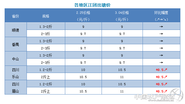 1、廣東江團本周與上周相比大小魚價格保持穩定,小魚價格還是9.0元/斤,大魚價格還是9.7元/斤。超大魚價格比較低,只要6.5元/斤,現在廣東江團存塘量還能滿足市場需求,價格暫時還會保持穩定。銷量差不多。