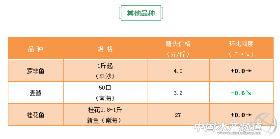 中國水產頻道原創報道,海水特種魚:海鱸級魚價格穩定,后市看穩 海水特種魚:中大規格海鱸價格微漲,供求穩定 鱸魚 本周海鱸中大魚打冰及水車價格均輕微上漲,目前存塘及需求穩定,在禁漁期來臨前預計相對價格波動不大。 立魚 珠海斗門:本周魚價相對穩定,波動不大,目前出魚量較少。 珠海小林:目前市場抓魚量沒有大量增加,魚中抓魚規格偏大,4.5兩上的立魚走量較大,4.5兩下的立魚不受市場歡迎走量非常小。3月份并不是出魚高峰期,預計4月份開始大量出魚。現在立魚病害少,氣溫合適生長,養殖戶不會集體性拋售,預計近期魚價穩定。 盲曹 統級10.5元/斤;大魚打冰10.5元/斤;市場存塘魚不多,后市趨勢預計較穩定。 黃花 存塘舊魚逐漸減少,夠規格上市的新魚數量不多,價格逐漸上升。 【關鍵字】:海魚 價格行情 水產養殖 |