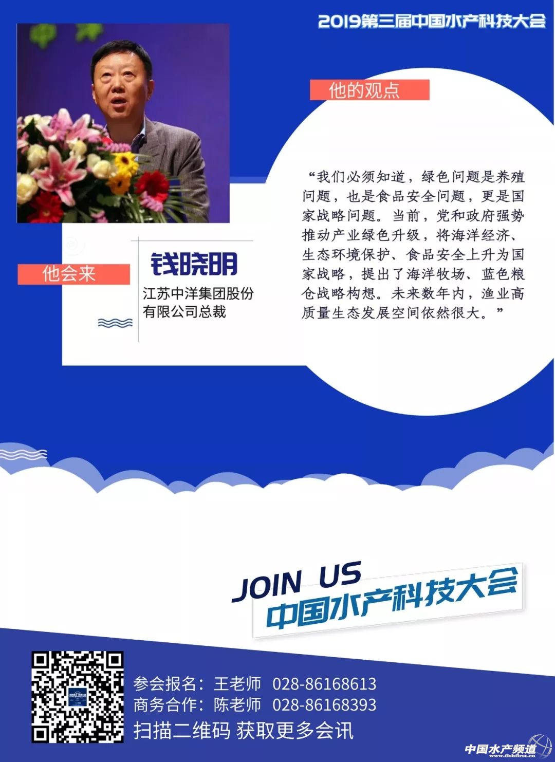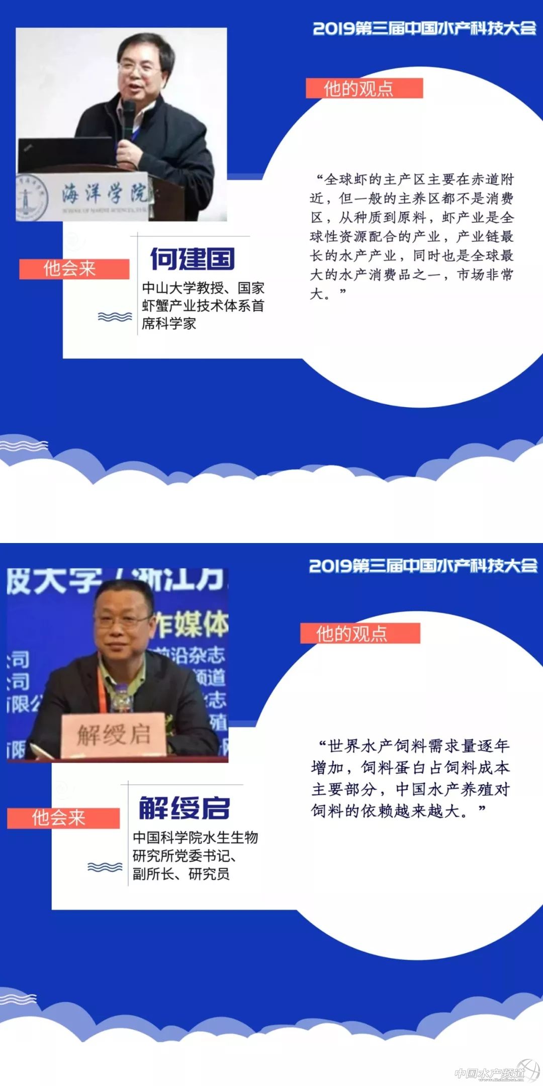 | 中國水產(chǎn)頻道獨家報道, 眾所周知 2019第三屆中國水產(chǎn)科技大會將于 4月26日在通威國際中心舉行, 大會高舉“創(chuàng)新驅(qū)動質(zhì)量興漁”大旗, 匯聚重磅行業(yè)大咖、水產(chǎn)精英, 共謀行業(yè)發(fā)展,聚焦創(chuàng)新驅(qū)動! 你想知道—— 大咖頭腦風暴有沒有??有! 滿滿的干貨有沒有??有! 馬上揭曉 前方高能 一大波水產(chǎn)界大咖來襲 |