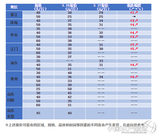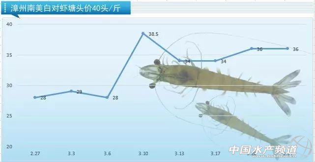 | 中國水產頻道報道, 文/圖 水產前沿 植銀素 本周行情 從本周的蝦價走勢圖可以看出,對蝦價格漲勢并未減弱。廣東、福建兩大冬棚蝦產區存塘蝦已經所剩無幾,珠海、中山漲幅超4元/斤,江門地區40頭蝦對比上周同期漲7元/斤,高達38元/斤。 據江門當地一位蝦中介紹,現在收蝦報價都得提高一點,好讓養殖戶出蝦,但是現在價格已經不是問題,主要是沒蝦!叭蔽r,現在沒蝦收,只能收一天是一天!彼f道。近期亦有不少北方蝦中打聽南方蝦價行情,山東日照地區報價員表示:“對蝦一天一個價,天天都在漲,25頭蝦已經賣到50元/斤!” 珠海 40頭37元/斤,50頭35元/斤。珠海存塘量非常低,蝦價持續高漲,養殖戶表示現在在珠海已經很少見到有收購商,蝦中都已經到陽江找蝦了。 中山 35頭38元/斤,50頭33元/斤,60頭30元/斤。中山地區本周漲幅達到4元/斤,存量和珠海情況相同,有價無蝦是珠三角地區普遍情況。 江門 40頭38元/斤,50頭35元/斤,60頭30-32元/斤。江門地區收購商表示現在江門地區已經無蝦可抓,即使是100條的小蝦都有20元/斤的報價,存塘都是小蝦。 汕頭 本周蝦價30頭37元/斤,40頭35元/斤,50頭31元/斤。汕頭地區目前存量慢慢消耗,價格上漲較快,目前40-50頭的規格比較受歡迎。 漳州 本周蝦價30條40元/斤,40頭36元/斤,50頭33元/斤,60頭30元/斤。對比上周,漳州40頭蝦價格上漲4元/斤,持續減少的存塘量讓價格上漲再加速。 湛江 徐聞地區高位池今日蝦價40頭30元/斤,50頭25元/斤。湛江地區的價格相較上周同期表現較為穩定,存量慢慢見底,預計后期價格上漲。 |