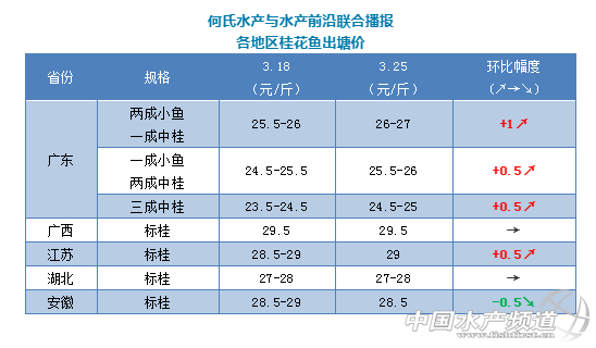 | 中國水產頻道原創報道, 文/圖 何氏水產、水產前沿 李靜 鱖魚 本周全國桂魚價格都在上漲,特別是廣東偏小魚的價格上漲比較多,幅度達到1元/斤,偏小魚從上周起市場行情好,貨源緊缺。江蘇標桂價格上漲了0.5元/斤,安徽那邊標桂市場行情一般,價格稍下跌了0.5元/斤,其他兩大產區價格與上周一樣,本周總體銷量跟上周差不多。 1.廣東桂魚本周價格與上周相比都有0.5-1元/斤的上漲,特別是偏小的魚價格上漲最多,現在偏小魚存塘不多,市場需求又比較大,供不應求。現在最好規格的魚(7-8成標桂,不到1成中桂)價格最高訂到27元/斤,有1成中桂的價格在26-26.5元/斤,大部分成交價在24.5-26元/斤為主,主要看實際規格和出魚時間來定價。現在廣東桂魚存塘量還是以偏大魚為主,偏小魚比例不多,后市看好。隨著桂魚繼續排卵,體重下降,養殖成本上升,預測接下來價格還會穩中有升,銷量平穩。 2.江蘇主產區的標桂價格本周穩定在29元/斤,其他規格價格22元/斤,養戶都在分規格賣魚;安徽由于市場行情稍差,價格下跌了0.5元/斤,銷量下降。其他兩個產區價格和銷量暫時穩定。 |