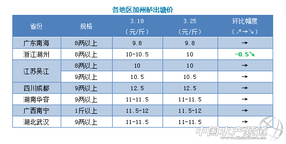 | 中國水產頻道原創報道, 文/圖 何氏水產、水產前沿 李靜 加州鱸 本周全國加州鱸價格與上周相比整體穩定,只是浙江湖州地區塘頭價下跌了0.5元/斤。 1、廣東鱸魚本周開塘價與上周一樣, 8兩以上還是9.8元/斤,1斤以上10元/斤,塘頭成交價暫時穩定。現在沙頭產區基本上很少出魚,九江、順德以及珠三角其他地區出魚的比較多,最終成交價還是看8兩以上比例和質量來定價。現在廣東鱸魚存塘量還是比較多,但是現在的成魚出現大肚或花身現象,塘頭質量不穩定,預計本周價格暫時還會保持穩定,銷量預計也會平穩。 2、本周浙江湖州鱸魚價格還是出統貨為主,價格比上周下跌了0.5元/斤,8兩以上成交價10元/斤,統貨價格8.5-9元/斤,銷量差不多。江蘇吳江價格與上周一樣,8兩以上還是10元/斤,9兩以上還是10.5元/斤,出魚量穩定,部分養戶持觀望態度。其他產區的價格與上周基本一樣,銷量穩定。 |