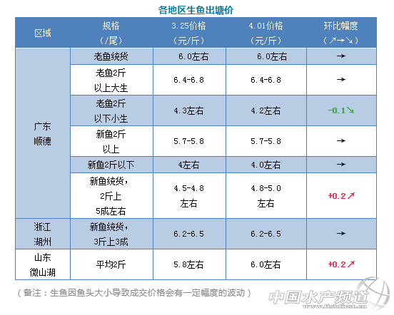 | 中國水產頻道原創報道, 文/圖 何氏水產、水產前沿 李靜 生魚 廣東生魚本周價格與上周差不多,只是有個別規格的價格有0.1-0.2元/斤的稍調,其他規格價格不變。 1、2斤以下小生價格與上周相比下跌了0.1元/斤,銷量與上周差不多。老魚存塘量越來越少,價格還會有上漲空間。 2、新魚2斤以上5成的統貨成交價上漲了0.2元/斤,成交價4.8-5.0/斤左右,2斤以上成數越多價格越高,6成以上的成交價在5.0元/斤,3-4成的價格在4.5元/斤左右,主要看抓魚的規格與魚頭來定價。2斤以上新魚,魚頭4斤左右的,價格跟上周一樣,成交價5.7-5.8元/斤,新魚2斤以下成交價比跟上周差不多,還是4元/斤。中小生銷量與上周差不多,預計接下來價格變化不大,銷量與本周差不多。 3、浙江湖州本周價格與上周一樣,山東微山湖價格比上周上升了0.2元/斤,銷量與上周也是差不多,預計接下來變化不大。 |