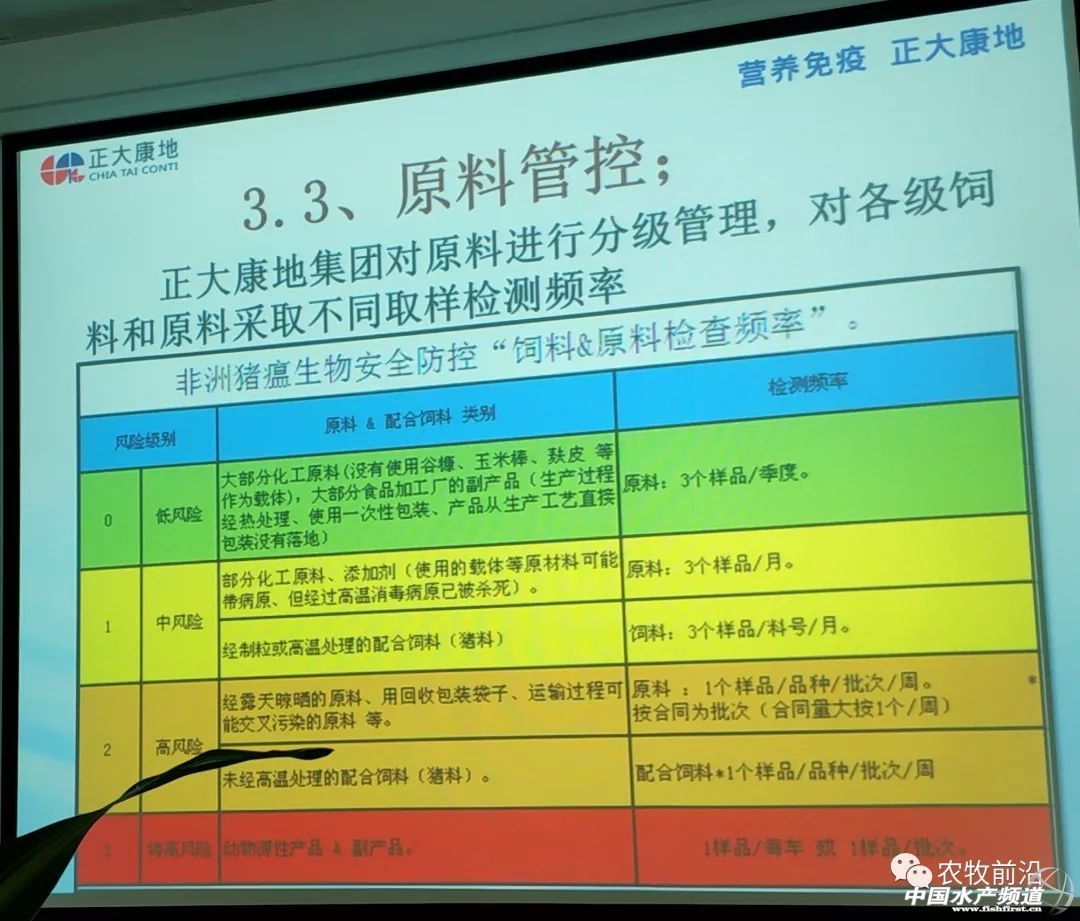 | 中國水產頻道原創報道, 文/圖 農牧前沿 劉程 在非洲豬瘟一波又一波的攻勢下,“生物防控”成為了行業熱詞。如今各種“正道措施”、“民間偏方”一擁而上,讓人眼花繚亂分辨不清。當然,每個企業對于生物防控都有自己的觀點,在尚無“解藥”的非瘟病毒下,我們無法判斷哪種就是對哪種就是錯。當下,農牧前沿希望通過了解不同企業的不同防控方案找到真實有效的方式方法。 與飼料企業普遍高喊的“高溫加熱”不同,正大康地對于生物安全防控有自己的獨特見解,第一個提出“打造無非洲豬瘟病毒安全工廠”,并且認為飼料廠生物安全防控要從源頭切斷,防止任何有風險的原料、車輛、物品進入廠區。4月3日,農牧前沿受邀參觀東莞正大康地飼料有限公司,一起來看他們是如何從源頭把“非洲豬瘟病毒”拒之門外的。 左二:正大康地技術部陳智明助理副總裁;中:正大康地總裁辦丁增光助理副總裁 右二:正大康地東莞基地陳滄一助理副總裁;右一:正大康地營銷中心成甲忠助理副總裁 據了解,自非洲豬瘟疫情爆發后,正大康地在第一時間建立了生物安全管理制度,管理手冊最初版本發布于去年9月14日,期間不斷更新修正,今年3月份又發布了最新的廠區生物安全制度,涵蓋了人員管控、車輛管控、原料管控和其他消毒管理四大方面。 原料“批批檢”,絕不“放過”人車物 正大康地對入廠原料實行分級管控,分為低風險、中風險、高風險、特高風險,采取不同取樣檢測頻率。對于特高風險的動物源性產品、副產品和高風險的飼料原料、未經高溫處理的配合飼料采取“批批檢”,對其每一批次都進行取樣檢測。 廠區內設有中央化驗室,針對每種原料會定期開展非洲豬瘟病毒PCR檢測和沙門氏菌等細菌檢測。中央化驗室自今年3月12日開展非洲豬瘟熒光定量PCR檢測后,至今共檢測了包括飼料原料、添加劑、飼料成品、環境樣品和抽檢車輛樣品等219個樣品,非洲豬瘟檢測結果全部為陰性。 外來人員進入廠區,要進行雙手噴霧消毒和鞋底消毒,并且穿上防護鞋套,填寫來訪登記表才能進入,安保人員會每天更換消毒液,疫情期間禁止客人參觀生產區域。 公司內部車輛只能停在辦公區,禁止進入生產區。來訪人員車輛則需在客人專用車位停放。嚴禁任何運輸過動物的車輛進入廠內,所有飼料運輸車及外來車輛都要進行消毒操作,車輛有專門的消毒通道。 此外,廠區其他地方也做了充足的防護措施。例如,飯堂地板、司機吸煙室等每天進行消毒;收取快遞有嚴格的消毒檢測流程;廠區內增加防鼠防蟲措施;廠內嚴禁外來未熟豬肉入廠、食堂不再提供豬肉菜品;同時對員工開展定期生物安全防控培訓等。 一季度豬料仍有上漲,“抓豬不放禽魚” 在交流環節,正大康地總裁辦丁增光助理副總裁、正大康地技術部陳智明助理副總裁、正大康地營銷中心成甲忠助理副總裁等回答了媒體現場提問。 正大康地技術部陳智明助理副總裁認為,防控非洲豬瘟飼料廠責無旁貸,目前正大康地東莞基地,有形的、能看到的防控設施設備投入已經超過25萬,還有很多無形的投入。他認為消毒防疫措施會變成未來飼料廠的標配,但最核心的防控還是在于養殖場,正大康地建議養殖場當務之急是進行封場管理,不能掉以輕心,確保把所有能做的生物防控措施做到位。 “今年一季度正大康地飼料銷量實現逆勢增長,同比增幅雖然只有1%,但含金量十足。”正大康地營銷中心助理副總裁成甲忠說,正大康地在提速增量的策略下,會進一步做大“蛋糕”,產品結構會作出適時調整,從721調整為622,總的策略方針就是“抓豬不放禽魚”,他同時強調,正大康地是以增量思維去推動這次產品結構調整的,牢牢抓住“發展是第一要務”。 |