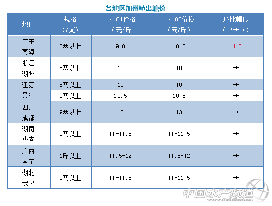 本周全國各主產區加州鱸價格與上周相比,因廣東清明節很多人不開工出魚,而出現貨源緊缺,導致廣東鱸魚價格上漲了1元/斤,銷量變化不大。