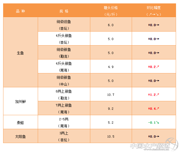 | 中國(guó)水產(chǎn)頻道原創(chuàng)報(bào)道, 文/ 珠海海龍 水產(chǎn)前沿 吳佳輝 海水特種魚(yú):海鱸下滑0.2元/斤,后市預(yù)計(jì)相對(duì)穩(wěn)定 鱸魚(yú):受天氣影響,游水魚(yú)塘出魚(yú)較多,魚(yú)價(jià)繼續(xù)下行,后續(xù)預(yù)計(jì)會(huì)相對(duì)穩(wěn)定。 立魚(yú):珠海小林:市場(chǎng)出魚(yú)量增加,以大規(guī)格立魚(yú)為主(4.6兩上),并且近期天氣適合立魚(yú)生長(zhǎng),且病害少,客戶養(yǎng)殖積極性較高,所以立魚(yú)價(jià)格穩(wěn)定。 盲曹:統(tǒng)級(jí)10.5元/斤。大魚(yú)打冰10.5元/斤。魚(yú)苗成活率持續(xù)較差,市場(chǎng)存塘魚(yú)少,預(yù)計(jì)后市魚(yú)價(jià)穩(wěn)定。 黃花:目前舊魚(yú)存塘逐漸減少,新魚(yú)規(guī)格不夠上市,流通商開(kāi)始主動(dòng)找魚(yú),后續(xù)價(jià)格看漲。 |