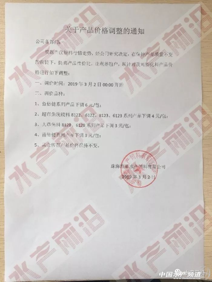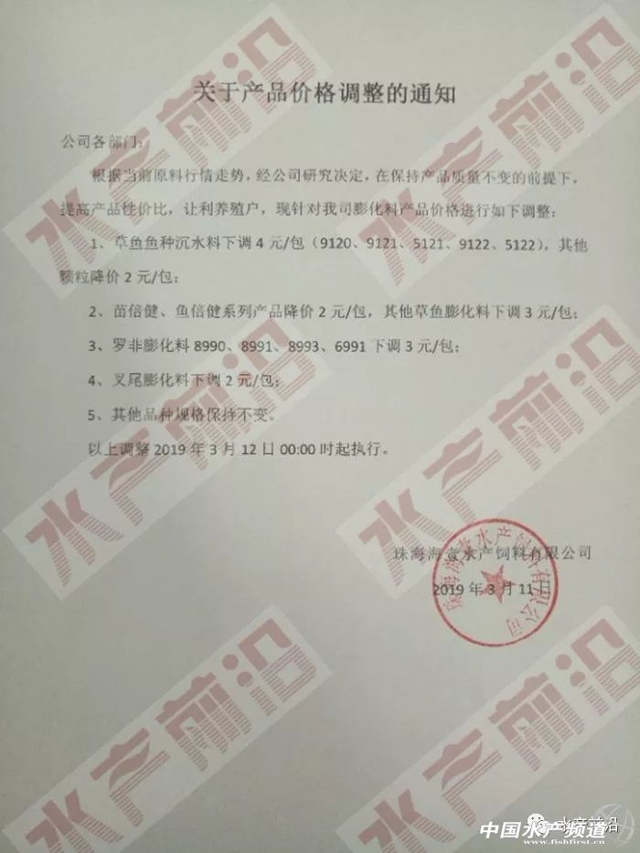 | 中國水產頻道原創報道, 文/ 水產前沿 鄭鵬飛 珠海海壹和珠海海龍可以說分別是海大和通威在華南片區的明星公司,在這輪飼料降價大戰中海壹和海龍的正面對抗也是最為激烈。就在海龍宣布再次降價之后,昨天珠海海壹魚料也是正式宣布今年的第5次飼料降價,草魚膨化料、叉尾膨化料以及多個品種的羅非膨化料全部下調2元/包,其中高樂寶系列膨化料全部下降5元/包。 珠海海壹飼料調價通知 不久前珠海海壹蝦料連續兩次降價幅度都達到300元/噸,果斷的大幅降價讓其他很多公司都望而卻步,不敢輕易跟著降。而在魚料的連續幾輪的降價中,珠海海壹魚料可以說是步步緊逼,一次不落,截止目前累計降價最高已經達到14元/包。為何2019年華南片區的飼料大降價如此激烈?珠海海壹蝦料總經理張奎引用了通威董事長劉漢元的一句話:往前一步一片光明,退后一步萬丈深淵! 附:珠海海壹飼料前4次調價通知 2月19日 2月22日 3月2日 3月11日 |