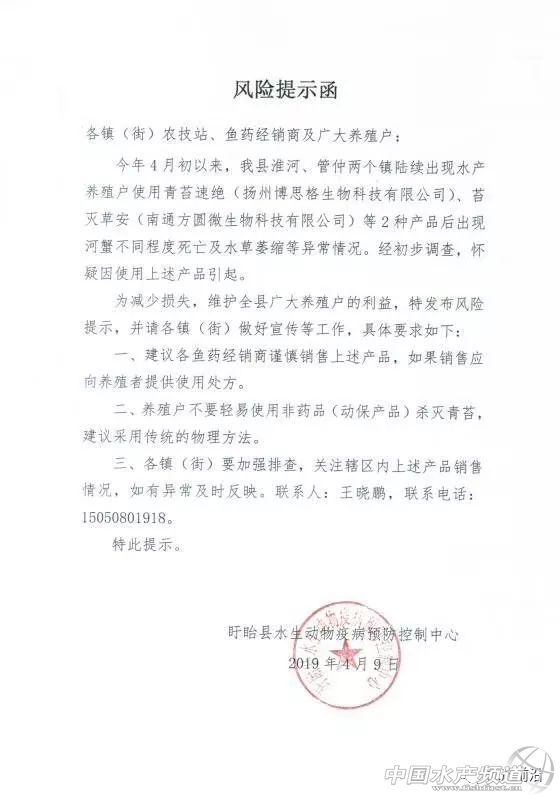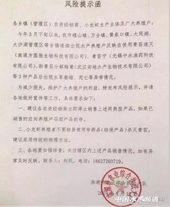 | 中國水產(chǎn)頻道原創(chuàng)報(bào)道, 愈演愈烈的滅青苔產(chǎn)品事故,誰將為多起悲劇埋單?他們做出最負(fù)責(zé)的回答! 文/ 水產(chǎn)前沿實(shí)習(xí)編輯 李帥 近日,水產(chǎn)業(yè)界人士被下面這則視頻刷屏了! 據(jù)視頻內(nèi)容顯示,這是一位在南京市高淳區(qū)蝦蟹養(yǎng)殖戶,其表示,因用了某廠家殺青苔的藥品,導(dǎo)致坂田上面寸草不生,60多斤的扁擔(dān)草籽撒到塘里沒有了,節(jié)節(jié)草也死光了,螃蟹受藥水刺激天天往岸邊爬,青蝦也死了不少,今年肯定是顆粒無收了,誰能為她討個(gè)說法? 此外,與視頻一起受到關(guān)注和熱議的,還有江蘇常熟、盱眙,湖北監(jiān)利、洪湖,安徽無為等地水產(chǎn)或農(nóng)業(yè)相關(guān)部門接連緊急發(fā)布的風(fēng)險(xiǎn)提示函、產(chǎn)品下架通知。據(jù)了解,事件是疑似部分漁藥廠家生產(chǎn)的滅青苔產(chǎn)品引起水草腐爛、小龍蝦、螃蟹大面積死亡現(xiàn)象。 據(jù)初步統(tǒng)計(jì),在本次事件中,單單是江蘇昆山市巴城鎮(zhèn)使用殺青苔藥受害事件涉及蟹農(nóng)戶數(shù)212戶、水產(chǎn)養(yǎng)殖面積2593.8畝。4月9日上午巴城鎮(zhèn)聯(lián)民村及周邊村29名蟹農(nóng)到巴城鎮(zhèn)反映情況,昆山市巴城鎮(zhèn)農(nóng)業(yè)服務(wù)中心、昆山市公安局巴城派出所、巴城鎮(zhèn)信訪辦、聯(lián)民村接待了蟹農(nóng),詳細(xì)了解事情情況,蟹農(nóng)訴求,安撫廣大蟹農(nóng)情緒,并做了登記,要求涉事蟹農(nóng)保持克制,合理合法維權(quán),切實(shí)維護(hù)社會(huì)穩(wěn)定。因此次事件涉及蟹農(nóng)戶數(shù)和水產(chǎn)養(yǎng)殖面積較大,給蟹農(nóng)造成了較大的損失。目前,昆山市巴城鎮(zhèn)人民政府已向昆山市人民政府書面匯報(bào)情況。 附:江蘇盱眙發(fā)布風(fēng)險(xiǎn)提示函 附:江蘇常熟發(fā)布產(chǎn)品停止銷售及風(fēng)險(xiǎn)提示函 附:湖北監(jiān)利發(fā)布風(fēng)險(xiǎn)提示函 附:湖北洪湖發(fā)布產(chǎn)品停止銷售及風(fēng)險(xiǎn)提示函 附:安徽無為發(fā)布產(chǎn)品下架及風(fēng)險(xiǎn)提示函 事故誰來負(fù)責(zé)? 滅苔風(fēng)波涉事企業(yè)回應(yīng):“責(zé)任明確之前,盡力做好服務(wù)!” 當(dāng)下最火爆的養(yǎng)殖品種莫過于小龍蝦與河蟹,2018年小龍蝦全國養(yǎng)殖面積超過2000w畝,產(chǎn)值破2600億,河蟹養(yǎng)殖面積1000w畝,產(chǎn)值破800億。產(chǎn)業(yè)蓬勃發(fā)展的背景下,各環(huán)節(jié)細(xì)節(jié)管理尚不成熟,導(dǎo)致問題頻發(fā)。其中滅苔一直困擾著從業(yè)者,大部分蝦蟹精養(yǎng)池塘既要兼顧殺滅青苔且不污染環(huán)境,還要不危害水草,不毒害水生生物。但養(yǎng)殖環(huán)境日新月異,青苔耐藥性不斷增加,這對漁藥動(dòng)保研發(fā)人員也是一個(gè)巨大的考驗(yàn)。 對于近期江蘇、湖北地區(qū)相繼發(fā)生養(yǎng)殖戶使用滅苔產(chǎn)品導(dǎo)致蝦蟹死亡事件,江蘇常熟、盱眙,湖北監(jiān)利、洪湖,安徽無為的相關(guān)部門已下發(fā)風(fēng)險(xiǎn)提示函,疑似部分廠家生產(chǎn)的滅苔產(chǎn)品引起水草腐爛、小龍蝦螃蟹死亡現(xiàn)象。有關(guān)部門也提醒養(yǎng)殖戶謹(jǐn)慎用藥,采用傳統(tǒng)方法滅青苔。農(nóng)林執(zhí)法部門更責(zé)令漁藥經(jīng)營部下架有關(guān)產(chǎn)品,召回封存已售產(chǎn)品,為受損養(yǎng)殖戶提供處方。接下來還會(huì)進(jìn)一步調(diào)查取證。 水產(chǎn)前沿雜志針對此次事件,采訪了部分涉事企業(yè)、蝦蟹養(yǎng)殖專家、動(dòng)保產(chǎn)品研發(fā)者,整理出以下幾點(diǎn)。希望能引起大家重視,妥善解決本次風(fēng)波,將水產(chǎn)養(yǎng)殖、動(dòng)保行業(yè)的損失降到最低。 截止發(fā)文前,一家涉事企業(yè)負(fù)責(zé)人回應(yīng)稱: “事件發(fā)生后,公司便第一時(shí)間趕赴現(xiàn)場。首先配合經(jīng)銷商,了解涉事養(yǎng)殖戶受損情況,安撫養(yǎng)殖戶情緒。并遵循執(zhí)法部門流程,提供產(chǎn)品標(biāo)準(zhǔn)和企業(yè)資質(zhì),將涉事藥品送到杭州、南京等地權(quán)威機(jī)構(gòu)進(jìn)行檢測,目前暫未有具體檢測結(jié)果公示。 不少從業(yè)者說可能是原料的問題。公司只能回應(yīng),對于配方,我們沒有添加多余違禁成分來提高功效,只是將原料供應(yīng)商的產(chǎn)品進(jìn)行精加工分包裝。 在最終結(jié)果沒有出來之前,事故原因無法判斷。要等政府最終下達(dá)處理意見,才能劃定是誰的責(zé)任,我們企業(yè)目前能做的也是最要緊的事是幫助養(yǎng)殖戶救藻救水草,保護(hù)好養(yǎng)殖戶的小龍蝦、螃蟹,避免二次受傷,力爭把他們的損失降到最低。 從事發(fā)到現(xiàn)在已經(jīng)一周多,我們的補(bǔ)救措施一直在做,后續(xù)還要繼續(xù)跟蹤,給他們提供解決方案,這是我們企業(yè)跟進(jìn)到底的一個(gè)態(tài)度。但最后還是要靠政府組織專家論證,包括檢測鑒定結(jié)果,有無違禁成分,給出一個(gè)處理方案。我們肯定執(zhí)行。” 水中泛濫的青苔 沒有涉及此次事件行業(yè)內(nèi)知名企業(yè)的看法 筆者還采訪了武漢九州神農(nóng)藥業(yè)有限責(zé)任公司董事長王建華,他對此次事件給水產(chǎn)動(dòng)保行業(yè)帶來的影響表達(dá)了看法。 “每年水產(chǎn)養(yǎng)殖業(y