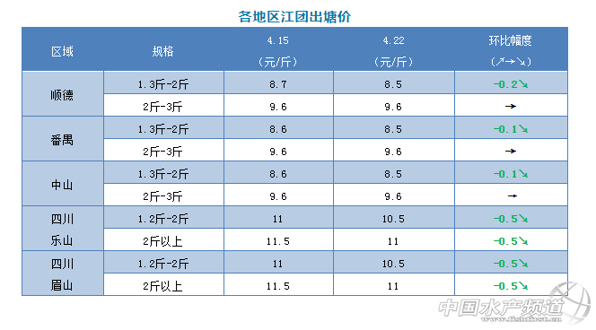 摘要: 本周廣東江團價格與上周相比下跌了0.2元/斤,小魚成交價是8.5元/斤,大魚價格還是9.6元/斤,超大魚價格還是在6.5元/斤。整體下滑,趨勢不大。