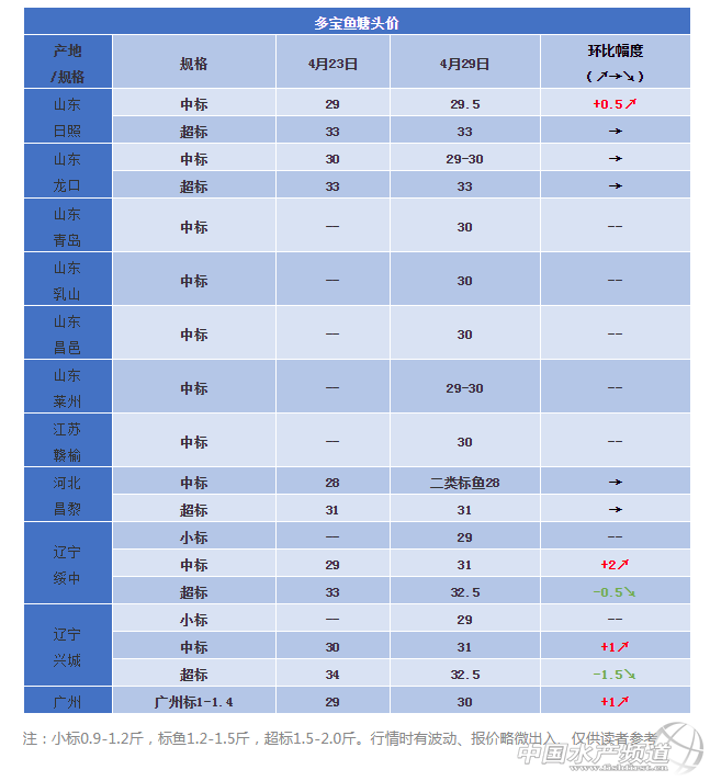 | 中國水產頻道原創(chuàng)報道, 五一將至,遼寧、山東多寶魚價格已至高峰,養(yǎng)戶出魚積極,魚販也加價收魚! 文 | 表 工業(yè)化水產圈 植銀素、李帥 本周行情 4月29日,山東多地標魚報價30元/斤, 遼寧綏中、興城標魚31元/斤,同比上周又漲1-2元/斤。超標魚價格略有下降,降幅0.5-1.5元/斤。 近期有收購商在交流群尋找2.0-2.5斤的超標大魚,報出35元/斤高價。當然,這是發(fā)生在山東某地的個例,要求的魚也較為特殊,能提供這種規(guī)格的多寶魚的養(yǎng)殖戶很少,自然有魚販肯出這么高的價格。希望各位養(yǎng)殖戶理性看待價格與行情,及時出魚! 本周,多寶魚上漲幅度已經略顯頹勢。盡管山東、遼寧綏中等地魚販大多加價收魚,以備五一節(jié)假日消費,但隨著節(jié)假日過去,市場熱度的降溫,多寶魚后市行情或許不會一直保持漲價的勢頭,或許會出現一段波折,小幅降價也是極有可能的,超標魚價格降低是很好的佐證。 據產地情況調查,近期多寶魚暢銷,大規(guī)模養(yǎng)殖基地和散戶集中出魚,貨源充足。但是不少養(yǎng)殖戶面對魚販表現價格強勢,惜售心理較強。這段時間內大家對價格敏感較為正常,業(yè)內人士建議養(yǎng)殖戶要依據自己資金儲備,理性出魚。 最后,筆者也希望所有的多寶魚養(yǎng)殖戶加強溝通,讓信息更通暢一些,每個人都能賣出高價,好價!近期山東萊州三山島地區(qū)也傳出要拆除多寶魚大棚的消息,這對山東未來多寶魚產業(yè)的影響尚不得知,是否會波及整個山東?工業(yè)化水產圈將繼續(xù)跟進,掌握第一手信息!如果您有任何消息爆料,歡迎加筆者微信溝通。 本周價格 感謝七好飼料(原料好、配方好、工藝好、品質好、長魚好、服務好、信譽好)、興城佳盈偉業(yè)商貿公司對本欄目的支持! |