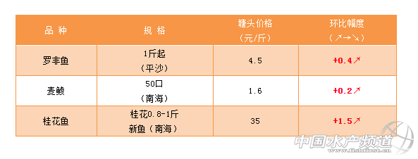| 中國水產(chǎn)頻道原創(chuàng)報(bào)道, 文/ 珠海海龍 水產(chǎn)前沿 吳佳輝 海水特種魚:海鱸價(jià)格微跌,后市預(yù)計(jì)上漲 鱸魚 鱸魚中大魚價(jià)格總體輕微下跌,本周經(jīng)歷了下行再回升,5月天氣穩(wěn)定加之禁漁期來臨,預(yù)計(jì)后市價(jià)格會(huì)上漲。 立魚 珠海小林:市場(chǎng)出魚量增加,以大規(guī)格立魚為主(4.6兩上),并且近期天氣適合立魚生長(zhǎng),且病害少,客戶養(yǎng)殖積極性較高,所以立魚價(jià)格穩(wěn)定。 珠海斗門:本周魚價(jià)穩(wěn)定。 盲曹 統(tǒng)級(jí)10.5元/斤;大魚打冰10.5元/斤。 黃花 級(jí)魚存塘數(shù)量不多,價(jià)格逐步上升。大魚需求少,價(jià)格穩(wěn)定,今年黃花放苗同比減少,預(yù)計(jì)禁漁期新魚數(shù)量不多,后續(xù)看漲。 其它品種 |