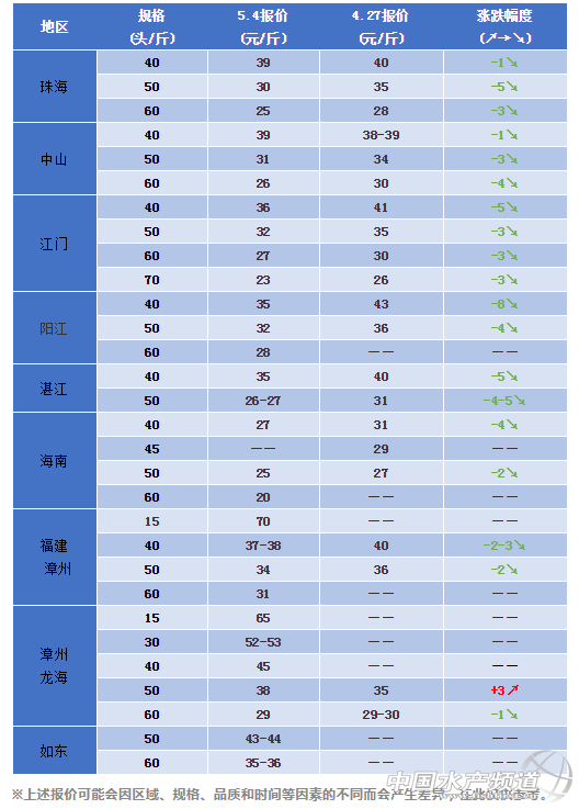 | 中國水產頻道原創報道, 珠三角蝦價行情遭遇“滑鐵盧”,福建蝦價維穩!5月4日全國南美白對蝦主產地塘頭報價 文/圖 水產前沿 植銀素 本周行情 在經歷五一假期效應之后,珠三角地區蝦價行情急速下滑,中山、珠海、江門均跌價5元/斤,中小規格蝦下跌尤為明顯。收購商表示假期后價格下跌1-3元屬于正常現象,但是病蝦上市多也是價格下跌的原因之一,近期市場上病蝦占到4成。 福建地區報價員表示近期價格穩定為主;養殖戶表示現在蝦塘存量不足,蝦中找蝦很積極,五一假期價格還是以上漲為主,據統計龍海地區50條蝦價格上漲了3元/斤。如東地區鍋爐加溫早苗養殖蝦4月15日相繼進入銷售,開稱最高單價54元,比上一年開稱價高12元,今日蝦價仍領跑全國大部分主產區。 據海外媒體IntraFish報道:一年前,南美白對蝦的價格跌至谷底,此后一直保持低位運行。尤其在印度、厄瓜多爾、越南,印度尼西亞等多個白蝦主產區產量持續增加,人均白蝦消費量不變的情況下,業內人士預計到2019年年底之前,蝦價還將保持在目前水平,或許節假日會帶動蝦價增長,但是全球蝦價或將進入調整期。 各地行情分析 珠海:本周蝦價40條39元/斤,50條30元/斤,60條25元/斤。對比上周同期珠海地區蝦價下滑3-5元,五一過后蝦價出現小幅回落,蝦中表示節假日后跌價屬于正常現象,市場仍缺大蝦,所以40條蝦價格較穩定。 中山:40條39元/斤,50條31元/斤,60條26元/斤。中山地區養殖戶集中拋售病蝦,目前60-70條蝦上市較多,導致蝦價出現滑坡。 江門:40條36元/斤,50條32元/斤,60條27元/斤,70條23元/斤。江門地區蝦價下滑較為嚴重,40條蝦下滑5元/斤。蝦中表示五一當天價格較好,之后幾天整個廣東市場表現低迷,價格每天都在掉。 陽江:40條35元/斤,50條32元/斤,60條28元/斤。報價員表示陽江地區價格回落主要是因為節假日過后需求降低的價格回落,病蝦導致是其中小部分原因,目前市場對高品質大蝦仍有需求。 湛江:40條的35元/斤,50條26-27元/斤。湛江地區價格從4月底開始呈現持續下跌趨勢。五一假期期間亦沒有明顯上漲,行情較低迷。 海南:40條27元/斤,50條25元/斤,60條20元/斤。海南地區蝦價跟跌,養殖戶表示近兩日上市的中小規格蝦增多,而且以病蝦為主,目前海南貨源較為充足。 福建漳州:15條70元/斤,40條37-28元/斤,50條34元/斤,60條31元/斤。相比廣東地區蝦價低迷的情況,福建地區的價格保持穩定,尤其是大蝦仍有較高的價格。龍海地區40條45元/斤,30條52元/斤,50條38元/斤,60條29元/斤。龍海地區價格仍呈現上漲姿態,50條蝦漲幅達到3元/斤,養殖戶表示近兩日收購商仍在積極找蝦,市場需求較大。 |