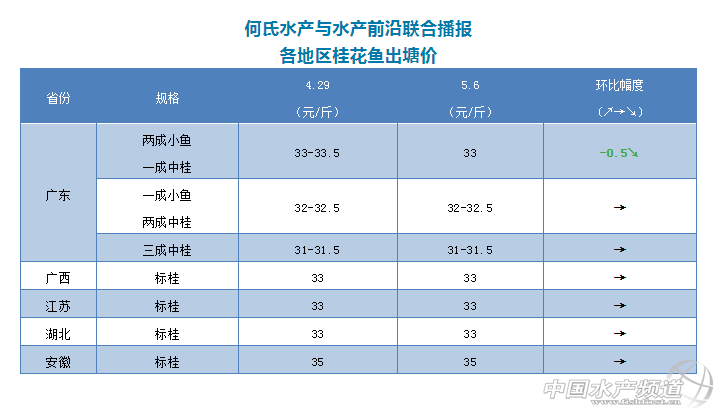 1、今天廣東桂魚價格與上周同期相比整體差不多,上周4月29號-5月1號這三天市場行情非常好,銷量上升了大概30%,不夠魚的收購商加價開魚,塘頭價一度猛漲,從5月2日開始市場開始爛市,銷量一落千丈,開塘價隨之回落。現在最好規格的魚(6-7成標桂,1成中桂)價格最高訂到33元/斤,偏大點的魚價格在32元/斤左右,中桂越多價格越低。主要看實際規格和出魚時間來定價。現在塘頭價比較亂,按現在的開塘價,收購商處于虧本狀態。