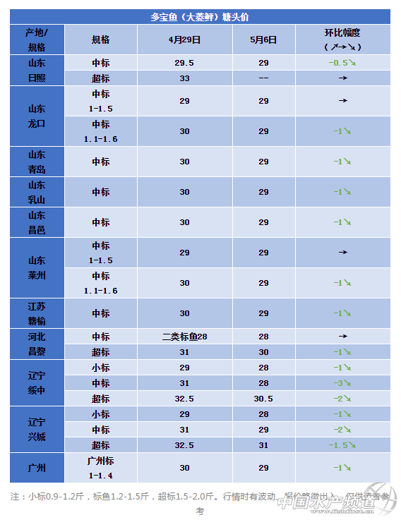 | 中國(guó)水產(chǎn)頻道原創(chuàng)報(bào)道, 業(yè)內(nèi)人士仍看好6月行情!五一過(guò)后,遼寧、山東多寶魚(yú)價(jià)格略微回落。養(yǎng)戶可以暫養(yǎng)以觀后市! 文 | 表 工業(yè)化水產(chǎn)圈 李帥、植銀素 一周要聞 近日,針對(duì)弧菌病研發(fā)的大菱鲆(俗稱(chēng)多寶魚(yú))鰻弧菌基因工程活疫苗(MVAV6203株)正式獲批國(guó)家一類(lèi)新獸藥證書(shū)。該疫苗與2017年誕生的針對(duì)腹水病的大菱鲆遲鈍愛(ài)德華氏菌活疫苗聯(lián)用后,多寶魚(yú)的養(yǎng)殖死亡率有望被控制在10%以?xún)?nèi),并有效降低養(yǎng)殖用抗生素的使用。 田間預(yù)試驗(yàn)中,1萬(wàn)尾規(guī)模的大菱鲆幼魚(yú)在簡(jiǎn)單浸泡免疫給藥(1-3 min)后,即可實(shí)現(xiàn)弧菌病3個(gè)月80%以上的有效免疫保護(hù)力。免疫后經(jīng)國(guó)家水產(chǎn)品質(zhì)量監(jiān)督檢驗(yàn)中心產(chǎn)品質(zhì)量檢測(cè),魚(yú)體內(nèi)殘留毒性安全指標(biāo)優(yōu)于國(guó)家標(biāo)準(zhǔn)。據(jù)了解,該大菱鲆鰻弧菌基因工程活疫苗研發(fā)成果已轉(zhuǎn)化給上海浩思海洋生物科技有限公司。 本周行情 5月6日,山東多地報(bào)價(jià)標(biāo)魚(yú)29元/斤,遼寧綏中、興城標(biāo)魚(yú)28元/斤,同比上周跌1元/斤。超標(biāo)魚(yú)價(jià)格略有下降,降幅1-2元/斤。 如上周業(yè)內(nèi)人士預(yù)測(cè),節(jié)假日過(guò)后,多寶魚(yú)消費(fèi)市場(chǎng)略微疲軟,走量下降。直觀放映在價(jià)格上面,幾乎所有規(guī)格都下跌1-2元/斤。這段時(shí)間內(nèi)大家對(duì)價(jià)格敏感較為正常,又剛剛經(jīng)歷一波行情走高,對(duì)利潤(rùn)有更高的要求,節(jié)后價(jià)格降低,自然會(huì)產(chǎn)生落差感。 根據(jù)各養(yǎng)殖市場(chǎng)和消費(fèi)市場(chǎng)反饋信息綜合得知,五、六月份超標(biāo)魚(yú)缺口較大,魚(yú)價(jià)有望穩(wěn)步上漲!以往養(yǎng)殖戶超標(biāo)魚(yú)存量不敢太大,在當(dāng)前階段,可以選擇將標(biāo)魚(yú)暫養(yǎng),等到消費(fèi)旺季出售大規(guī)格,獲取較好的經(jīng)濟(jì)效益! 本周開(kāi)始也進(jìn)入史上最嚴(yán)休漁期,鮮活餌料魚(yú)價(jià)格上漲,業(yè)內(nèi)人士建議養(yǎng)殖戶盡量不用或者少用冰鮮來(lái)控制成本。也可以避免夏季高溫期和雨季來(lái)臨時(shí)投喂鮮餌造成的水質(zhì)波動(dòng),病菌繁殖。做好日常管理,加固魚(yú)棚,進(jìn)、排水口設(shè)備,防風(fēng)防雨防雷暴天氣的準(zhǔn)備。 同時(shí)也希望所有的多寶魚(yú)養(yǎng)殖戶加強(qiáng)溝通,讓信息更通暢一些,每個(gè)人都能賣(mài)出高價(jià),好價(jià)! 本周價(jià)格 |
