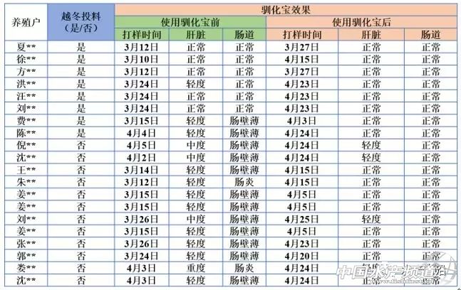 | 中國(guó)水產(chǎn)頻道報(bào)道, 文/圖 澳華集團(tuán) 蔡萬(wàn)存 一、市場(chǎng)背景介紹 中國(guó)作為世界第一大水產(chǎn)養(yǎng)殖大國(guó),其水產(chǎn)養(yǎng)殖業(yè)發(fā)展速度迅猛。而草魚(yú)作為四大家魚(yú)養(yǎng)殖之首,其年養(yǎng)殖量及市場(chǎng)消費(fèi)量均首屈一指。然而由于越冬未投料、養(yǎng)殖密度過(guò)大,飼料營(yíng)養(yǎng)不均衡、水質(zhì)環(huán)境惡化、亂用藥物和低質(zhì)飼料中含有有毒物質(zhì)等系列原因,草魚(yú)肝臟受損嚴(yán)重并誘發(fā)脂肪肝。而脂肪肝的發(fā)生極大程度會(huì)導(dǎo)致機(jī)體代謝紊亂及免疫力下降,嚴(yán)重時(shí)甚至導(dǎo)致大量死亡,嚴(yán)重影響經(jīng)濟(jì)效益。從事草魚(yú)養(yǎng)殖的朋友們一直以來(lái)都被草魚(yú)肝腸疾病所困擾,而草魚(yú)肝腸受損往往又是魚(yú)病發(fā)生及難以控制的核心所在。因此,筆者通過(guò)對(duì)市場(chǎng)走訪,主要圍繞越冬以及開(kāi)春草魚(yú)肝臟和腸道情況進(jìn)行深入剖析,旨在強(qiáng)化養(yǎng)殖朋友對(duì)草魚(yú)肝腸健康的重視。 二、肝腸主要機(jī)能及健康狀況判別 為了更好的了解草魚(yú)肝臟和腸道,首先簡(jiǎn)單介紹肝臟和腸道主要機(jī)能以及如何判斷草魚(yú)肝臟和腸道健康狀況。 (1)肝臟主要機(jī)能及健康狀況分級(jí): 魚(yú)類(lèi)肝臟是維持正常生理機(jī)能的核心器官,主要功能包括:物質(zhì)合成中心(蛋白質(zhì)合成、脫氫、轉(zhuǎn)氨、酯蛋白的合成)、分泌和排泄功能(生成膽汁酸和分泌膽汁,促進(jìn)腸道脂肪消化和吸收)、解毒功能(清除有害物質(zhì)和殘留藥物)、免疫功能(吞噬越過(guò)腸屏障進(jìn)入肝臟的微生物)等。 正常健康的肝臟主要特點(diǎn)為:肝臟紅潤(rùn)(呈新鮮的豬肝色)、肝臟富有彈性。如下圖所示: 由于集約化養(yǎng)殖,飼料營(yíng)養(yǎng)不均衡、養(yǎng)殖密度過(guò)大、水質(zhì)環(huán)境惡化、亂用藥物等系列原因,草魚(yú)肝臟常常會(huì)出現(xiàn)花肝、白肝、黃肝、綠肝等典型癥狀,如下圖所示?蓪⒉煌伾闻K進(jìn)行分級(jí)定義,如花肝定義為輕度脂肪肝、白肝定義為中度脂肪肝,黃肝定義為重度脂肪肝。 (2)腸道主要機(jī)能及健康狀況分級(jí): 腸道是營(yíng)養(yǎng)物質(zhì)消化和吸收的主要場(chǎng)所。此外,魚(yú)類(lèi)腸粘膜屏障系統(tǒng)具有阻礙腸腔內(nèi)細(xì)菌入侵和毒素吸收的功能。正常腸道具有腸壁厚、腸道韌性足、腸絨毛豐富且完整等特點(diǎn)。如下圖所示: 由于越冬長(zhǎng)期未進(jìn)食、腸道寄生蟲(chóng)滋生、細(xì)菌感染,飼料營(yíng)養(yǎng)不均衡等原因,常常會(huì)出現(xiàn)腸壁薄、腸絨毛稀疏、腸炎、寄生蟲(chóng)寄生等典型癥狀。如下圖所示: 三、越冬及開(kāi)春養(yǎng)殖困境 1、 冬季魚(yú)類(lèi)不攝食,掉膘比例約達(dá)10%以上:魚(yú)類(lèi)維持正常生長(zhǎng)代謝需要消耗大量蛋白質(zhì)、脂肪以及碳水化合物。這些營(yíng)養(yǎng)物質(zhì)主要由飼料提供。冬季不投喂,魚(yú)類(lèi)將消耗自身脂肪儲(chǔ)備,甚至消耗體蛋白,出現(xiàn)嚴(yán)重掉膘現(xiàn)象。掉膘比例約在5%-20%不等。 2、 肝膽腸道負(fù)荷大,魚(yú)體免疫力下降:冬季長(zhǎng)時(shí)間不投喂,魚(yú)類(lèi)機(jī)體分解代謝大于合成代謝。肝臟是機(jī)體新陳代謝的核心部位。因此,越冬魚(yú)常常會(huì)出現(xiàn)花肝、白肝、綠肝、肝臟萎縮等癥狀。此外,腸道因長(zhǎng)期不消化食物會(huì)導(dǎo)致腸道黏膜脫落,使得腸壁變薄,極易造成腸炎的發(fā)生。 3、 投喂顆粒料易散、浪費(fèi)大、壞水:低溫情況下,魚(yú)類(lèi)采食量低且攝食速度慢。顆粒料由于耐水性差,常常未被魚(yú)類(lèi)攝食便散開(kāi)。一方面會(huì)造成飼料浪費(fèi);另一方面會(huì)造成水質(zhì)污染,加大越冬管理風(fēng)險(xiǎn)。 四、市場(chǎng)調(diào)研數(shù)據(jù)分析 3月份全國(guó)各地草魚(yú)疾病暴發(fā),部分塘口草魚(yú)種均有不同程度的死亡,而究其原因無(wú)不與草魚(yú)越冬后肝腸受損有關(guān),筆者通過(guò)對(duì)浙江及上海地區(qū)越冬期間投喂冬藏寶和未投喂冬藏寶養(yǎng)殖塘口進(jìn)行打樣分析,旨在探究冬季是否需要進(jìn)行合理投喂。此外,通過(guò)對(duì)開(kāi)春后使用澳華馴化寶的塘口進(jìn)行打樣分析,旨在驗(yàn)證馴化寶對(duì)越冬魚(yú)肝腸修復(fù)效果。以下為浙江龍游、金華、嘉興及上海地區(qū)20位養(yǎng)殖戶塘口的調(diào)研結(jié)果: 注:因樣本數(shù)有限,以下分析結(jié)果僅供本文分析使用。 (1)越冬是否投喂冬藏寶肝腸健康狀況 分析:對(duì)比越冬投喂冬藏寶和未投喂冬藏寶肝臟健康狀況,結(jié)果表明:投喂冬藏寶正常肝臟比例為62.5%,而冬季未投料,肝臟均出現(xiàn)不同程度損傷。此外,冬季投喂冬藏寶,輕度肝病比例為37.5%,而未投料出現(xiàn)嚴(yán)重(中度和重度)肝病比例達(dá)到33.33%。由此可見(jiàn),越冬投喂澳華冬藏寶,可以很好的保護(hù)草魚(yú)肝臟以免受損。 分析:對(duì)比越冬投喂冬藏寶和未投料草魚(yú)腸道健康狀況,結(jié)果表明:越冬投喂澳華冬藏寶,草魚(yú)腸道壁比較厚,腸絨毛豐富,正常腸道比例達(dá)75%。而越冬未投料草魚(yú)腸道普遍存在腸道壁薄的問(wèn)題,其中有16.6