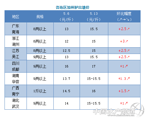 | 中國水產頻道原創報道, 文/圖 何氏水產、水產前沿 李靜 加州鱸 本周全國加州鱸價格全線飄紅,漲幅在1-3元/斤,銷量平穩,由于大魚貨源有些緊缺,有時不能滿足客戶需求。 1、廣東鱸魚8兩以上開塘價比上周漲了2.5元/斤,達到15.5元/斤,1斤以上價格16元/斤。最終成交價還是看8兩以上比例和質量來定價。現在除沙頭產區外的養戶都在清塘出魚,都是以偏小魚為主,魚頭大部分在1.1-1.3左右。現在漲價,部分沙頭產區的養戶開始出魚,但出魚量也不大。總體鱸魚貨量供不應求,接下來價格暫時變化不大,銷量與上周差不多。 2、浙江湖州鱸魚價格還是出統貨為主,8兩以上價格比上周上漲3元/斤,達到15元/斤,統貨價格13-13.5元/斤,由于現在當地存塘量不多,出魚量也不大。江蘇吳江也緊隨廣東價格的漲勢,8兩以上價格比上周上漲了2.5元/斤,也是15元/斤,9兩以上15.5元/斤,現在本地大魚頭的庫存還是不多,大部分魚都是1.2-1.3斤的魚頭比較多,過些時間會吸引一部分外地收購商到本地收魚,銷量會隨之上漲。四川成都本地鱸魚存塘量越來越少,價格持續上漲,本周又上漲了1元/斤,達到17元/斤,接下來價格比較穩定,銷量相對少了。湖南華容、湖北武漢兩大產地的價格比上周分別上漲了1.3元和1元/斤,銷量也有不同程度的下降,廣西南寧價格與上周相比也上漲了1元/斤。 |