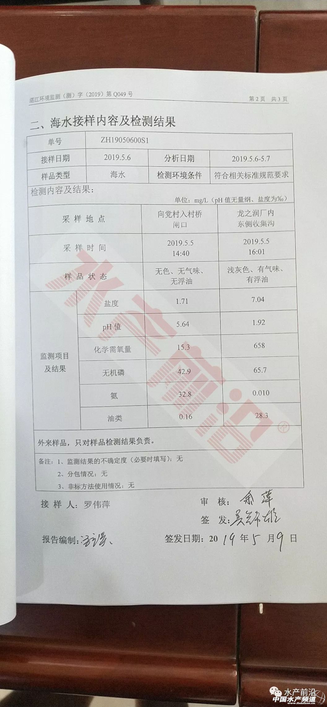 | 中國水產頻道原創報道, 相關檢測報告已出:廢水濃度超排放標準,但死魚原因未有定論。 文/圖 中國水產頻道 此前,中國水產頻道報道了雷州烏石港網箱養殖魚在短短1-2天內數幾十萬斤價值千萬元的石斑魚全部翻肚死亡,部分魚排已全軍覆沒,養殖戶血本無歸。眾人懷疑是當地一水產加工廠排污毒污水導致大批量魚慘死,事件一經報道,立刻引起了水產業界人士高度關注和熱議。 事件回顧: 5月5日約凌晨時分,部分人養殖的雜魚如黃鰭鯛等就出現大量的死亡,6日凌晨約1點時刻,珍珠龍膽相繼大規模死亡。養殖戶立刻采取了應急措施,全開增氧機、投放增氧劑,但仍然無濟于事,最終死魚量超過20萬斤,損失預計達上千萬元。 烏石港周邊有近200名養殖戶,其主要養殖品種多為珍珠龍膽。自烏石港網箱魚大量慘死后,養殖戶無心處理網箱中的死魚,漁船上、魚排上、籃子里、碼頭上堆滿了魚的尸體,大海上隨處可見飄浮的死魚,受災的養殖戶愁云滿面,對日后的生計一片茫然,甚者還會因此欠下巨債。 烏石港死魚事件發生后,為盡快查明魚類死亡原因并有效指導養殖戶自救,當地政府及環保部門積極邀請水產專家到烏石鎮調研,并在各養殖漁排調查取樣,隨后相關樣本送至湛江市相關機構做檢測。 如今,中國水產頻道獲悉事件最新動態,相關檢測結果已經出來,內容如下: 雷州市環境保護局 關于近期烏石鎮烏石港魚類非正常死亡 事件的調查報告 雷州市人民政府: 2019年5月5日上午,多名群眾到烏石鎮政府反映烏石港養殖區于當日凌展出現大量死魚,要求鎮政府處理,烏石鎮政府領導接訪后向相關部門反映了該情況,我局緊息派員對陸地上游情況進行排查,5月7日,我局監測人員再次對上下游進行了采樣監測。市政府對此事高度重視,5月8日,副市長曹康武組織了調查處置小組前往事發現場布置工作。經我局主要領導組成的調查組多次現場調查及走訪了解,現將調查情況報告如下: 烏石港作為漁港又同時接納了多條地表徑流及烏石鎮的生活污水,包括從上游覃斗鎮、農田沖刷的地表水、蝦塘推水以及上游位于烏石村附近的濕地塘水。2019年5月4日,烏石鎮下了一場久違的大雨,這是自去年中秋以來當地的第一場大雨,當天20時左右,積蓄多日的濕地水塘積水伴著雨水、上游沖刷地表水等水流排入海中。濕地水塘面積將近200畝,始于雙柜嶺集水塘,水路延伸約600米到達上游水閘,經過約800米蝦塘納水溝到達下游水閘,后通過長約1.6公里的海溝最終經情人橋入海。濕地水塘組成因素較為復雜,濕地水塘存在時間久,上游有大片荒地集水,底泥渾濁。 同時,我局對位于事發養殖區上游約3公里的雷州市龍之潤水產品有限公司進行了檢查,該公司主要經營魚皮及魚鱗加工,加工過程中產生廢水。執法人員在調查過程中發現,該公司將廢水從沉淀池引至距其廠區約300米的雙柜嶺上排放,監洲人員雙柜嶺上的管道口殘留的廢水進行了采樣監測,監測結果顯示廢水濃度超過了排放標準,市環保局已于5月6日依法立案并于5月8日向該公司發出《責令改正違法決定書》,責令該公司改正上述違法行為并立即停產整改,后續該案件將依法移送公安機關辦理。 由手事件情況較為復雜,魚死亡的具體原因我局無法判定,為此我局建議市農業農村部門和烏石鎮政府牽頭對此事進行全面調查,我局將密切配合農業農村部門和烏石鎮政府做好后續相關工作。 特此報告 附件: 1,監洲報告(湛江環境監湖(測)字(2019)第0049號) 2,監洲報告(湛江環境監湖(測)字(2019)第0050號) 雷州市環境保護局 2019年5月10日 網 友 意 見 相關檢測報告發出后,部分網友也對此事發表了自己的看法: 因河流上游下泄污水導致下游魚死亡事故的原因查找起來比較困難。因為水是流動的,幾天前的河水,跟現在相比水質可能完全不一樣,即污染團過去了。但是,如果通過監測發現下泄污水中如果有特征污染物的話,比如有重金屬鉻,還是可以開展溯源分析的,鎖定污染源是沿河的某家廠。 再者,無毒有害的生活污水大量進入河流,也會造成河流中大面積魚死亡事故。因為分解生活污水中的有機物,會消耗水中大量的氧,導致河流導致缺氧或無氧,直接導致魚蟹缺氧死亡。建議依法開展公益訴訟。據分析,此次魚死亡事故取證將非常困難,如果不能確認污染主體,要通過司法索賠存在很大難度。建議全國范圍內有條件的單位可以伸出援手開展公益訴訟,幫助受災的魚蟹養殖戶進行法律訴訟,助魚蟹養殖戶一臂之力。 相關檢測報告 廣東省水產經濟動物病原生物學及流行病學重點實驗室石斑魚檢測報告 |