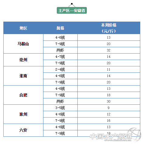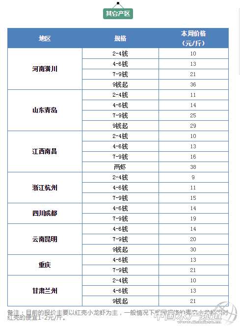 | 中國水產頻道報道, 小龍蝦上市正當時 全國小龍蝦行情解析 水產前沿與您相約每周四 文/ 水產前沿 鄭鵬飛 據了解,這兩天各地小龍蝦行情出現大漲,多個地區漲幅達到3元/斤。其中,湖北洪湖地區1兩的小龍蝦從35元/斤上漲到38元/斤,上漲3元/斤;湖南岳陽地區7-9錢的從16元/斤漲到18元/斤,上漲2元/斤;四川成都市場7-9錢的規格從16漲到了19元/斤,上漲3元/斤;北京市場上1兩的小龍蝦從33元/斤漲到了36元/斤,上漲3元/斤。廣州、上海、深圳等主要城市小龍蝦市場批發價均出現上漲。有養殖戶表示,這波小龍蝦價格至少要上漲3-5元/斤。 不過也有流通商反映,每年4-5月的這段時間小龍蝦價格都會有一次大的波動。尤其最近這段時間小龍蝦在猛跌了10元左右,這兩天價格又出現猛漲,價格很難預測。 全國小龍蝦最新行情 全國主要一線城市市場批發均價 全國主要一線城市市場批發價 主產區—湖北省 湖北小龍蝦主要產區平均批發價 |