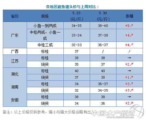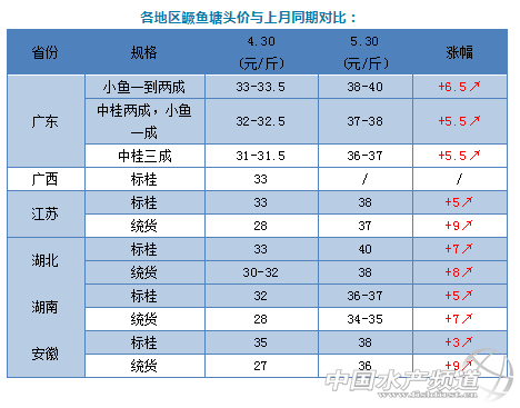 | 中國水產頻道原創報道, 文/圖 鱖鱸前沿 李靜 最近一周,鱖魚價格幾乎一天一個價,漲勢驚人。 目前,江蘇、湖北、安徽、廣西、湖南等主產區的桂魚基本出完,市場對鱖魚的需求主要依賴廣東供給,而近期廣東主產區也存塘告急,能出的魚不多了,加上高考前期,行情好轉,鱖魚市場嚴重供不應求,所以塘頭價格出現瘋漲。 今天,廣東鱖魚統貨塘頭價開到38-40元/斤,比上周同期飆升了5元/斤左右;湖北統貨今天也開到38元/斤;湖南標桂漲了3元/斤左右。各地區市場行情都有好轉,標桂銷量和需求量最大。按照現在的存塘情況,預計6-7月份,鱖魚價格還有一定上漲空間,7月中旬有斷供可能。 與上月同期對比,本月各省鱖魚價格都出現了大幅上漲。其中江蘇、湖北、安徽統貨漲幅最大,約8-9元/斤;廣東、湖南、湖北、安徽標桂也分別上漲了5-7元/斤。這種漲勢跟去年同期類似,大概每年5月中下旬鱖魚價格都會出現一輪暴漲,但今年漲勢比去年要猛一些。 與去年同期相比,今年廣東的鱖魚價格整體高出了5-6元/斤,而湖北標桂比去年同期竟高出了9元/斤,其他產區也比去年同期高出了3-6元/斤。可以想象,今年市場鱖魚存塘量確實比往年少很多,所以預計7月份的鱖魚價格可能要比去年高出不少,而今年早批鱖魚也將會有不錯的行情。 餌料魚 |