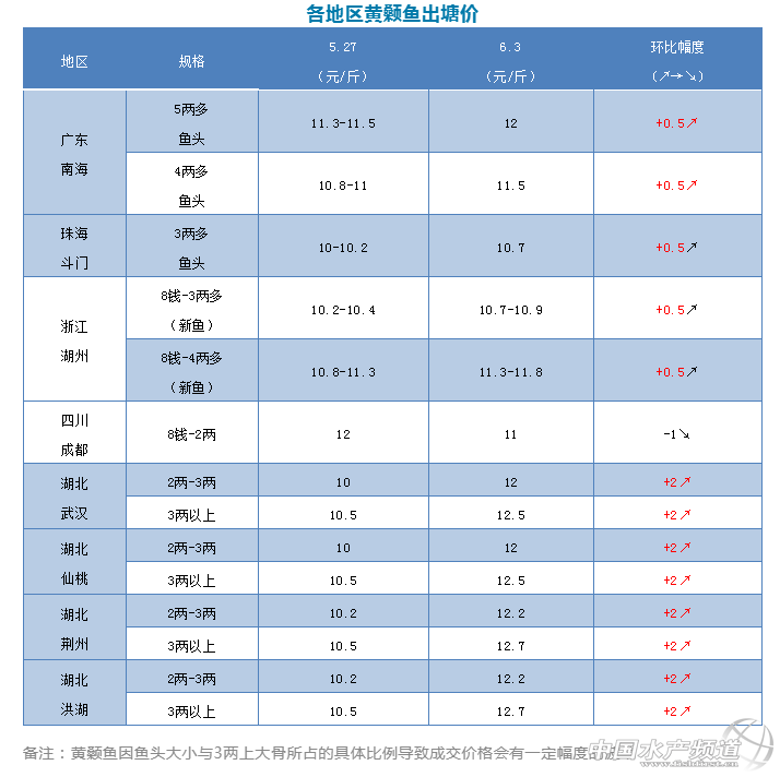 | 中國水產頻道原創報道, 文/圖 何氏水產、水產前沿 李靜 黃顙魚 1、本周廣東黃顙魚價格與上周相比都有0.5元/斤的漲幅,由于市場缺大魚導致價格上漲,5兩多魚頭價格上漲到12元/斤,4兩多魚頭價格漲到11.5元/斤,3兩多魚頭價格漲到10.7元/斤。后期隨著大規格魚的緊缺,四兩多、五兩多魚價格或將持續上漲,銷量會比上周多。 2、浙江湖州黃顙魚情況與廣東差不多,價格也比上周上漲了0.5元/斤。3兩多魚頭價格在10.7-10.9元/斤,4兩多魚頭價格在11.3-11.8元/斤,目前隨著全國氣溫升高,外地水車有所減少,銷量相對比之前有所下降,接下來價格還會有小幅的調整,銷量與現在基本差不多。 3、四川成都黃顙魚本周價格與上周相比下跌了1元/斤,價格在11元/斤,銷量下滑。湖北各產區大小魚價格比上周相比有大幅的上漲,漲幅達到2元/斤,由于本地區的存塘量越來越少,氣溫比較高,不適合到廣東來拉魚,轉為本地采購,需要量上升,價格大幅上漲。 |