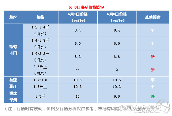 | 中國水產頻道原創報道, 節假日多宴席,大魚需求上升,小魚價格持穩。 文/ 水產前沿 陳曉慶 全新的海鱸行情周報正式開啟,每周與您相約,歡迎各位讀者交流看法與建議,提供更多地區價格行情,讓信息更暢通,讓每個人都能養好魚、賣好魚! 一周行情簡析 本周6月8日珠海斗門1.2-1.4斤規格的海鱸報價8.4元/斤,1.4-1.9斤規格海鱸報價8.0元/斤,與上周持平。本月初中、小規格海鱸下跌了0.2元/斤,但端午節期間又回漲了0.2元/斤。大規格海鱸節假日市場需求量大,1.9-2.2斤規格海鱸報價8.6元/斤,相比上周上漲了0.3元/斤,2.5斤以上規格的大魚更是漲到了9元/斤。業內人士認為,近期浮頭游水魚有所減少,養殖戶不再被迫出魚,價格會有所上漲。 福建涵江鱸魚1.4-1.8斤規格報價10.5元/斤,1.8斤以上報價10.3元/斤,與上周持平,漳州鱸魚1.3斤規格報價9.8元/斤,相比上周下跌了0.2元/斤。 養殖小貼士 目前處于季節交替的時間,氣溫變化幅度較大,尾批魚諾卡氏菌病情較為嚴重,養殖戶被迫出魚。諾卡氏菌病是典型的慢性病,單純由諾卡氏菌感染,一般死亡數量不大,天氣劇烈變化時容易引起大量死亡。發病魚一般不“游水”,有的魚體表潰瘍,特別是鰓蓋內緣、尾鰭基部嚴重。肝臟、腎臟、脾臟上有數量不等的白色結節,脾臟腫大。 諾卡氏菌病魚腎臟、脾臟、肝臟、腮絲上有大量白色結節(圖片來自海洋與漁業) |